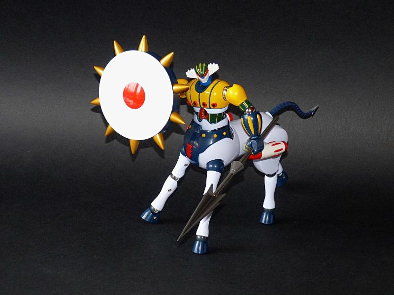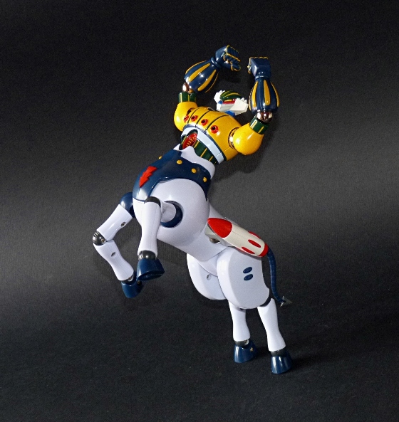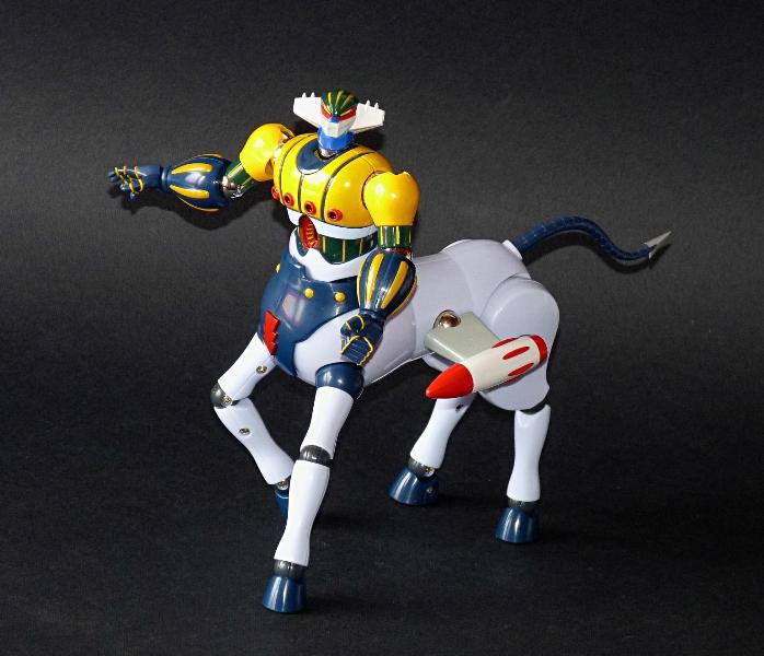 Il cavallino robotico è interamente costruito in plastica, è leggermente più alto del Jeeg e pesa circa 140 grammi. Considerandolo come un accessorio, tutto sommato è fatto più che discretamente, immediatamente riconoscibile rispetto alla controparte animata, ma il paragone con il metalloso e curato Jeeg è improponibile: in confronto sembra un semplice giocattolo. Comunque non mancano dettagli e accortezze come i tappini per le viti, snodi a scatto per le zampe e il collo (il muso invece è inchiodato, come il busto). Mobilità interessante, con zampe anteriori estendibili anche lateralmente, e possibilità di impennare il quadrupede senza utilizzare supporti extra. La ciliegina, naturalmente, è la configurazione in centauro, per cui si sfila la magnetica testa equina e la si sostituisce al Jeeg privato degli arti inferiori: il risultato ha sicuramente il suo perché, possente e d’effetto, solido e accattivante. E’ ancora possibile impennarlo senza aiutino! Ma è totalmente instabile, chiaro… Questa modalità centauro non è davvero niente male e fa la sua sporca figura. Provatela, potreste inaspettatamente sceglierla come posa da esposizione nella vostra vetrina.