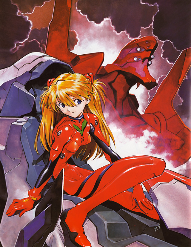 Shirahige Tsukuru omaggia ancora una volta Yoshiyuki Sadamoto (di cui metto ancora due settai) sbilanciando ed allungando sia il bacino che le cosce, ma aimè pur avendo un aspetto sincero nel complesso penalizza il sedere di Asuka in modo oltragioso; possiamo tranquillamente dire che scompare.Asuka è appoggiata sul suo Eva con la mano che le fa da perno, fotografata nell' atto di accavallare le gambe, il busto ruota accompagnando il volto verso l' alto a cercare il vento che le smuove la folta capigliatura che lei cerca di sistemarsi con la mano sinistra permettendo cosi' di alzare il braccio e valorizzare la partenza del seno anche qui come con Rei, non più da quattordicenne.