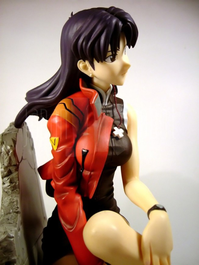 Kotobukiya ha fatto un ottimo lavoro, Misato è stata pittata in modo superiore, la giacca è piena di chiaroscuri che danno molto il senso della pelle sporca,(normalmente la pelle si lava di rado) in netto contrasto con l' abito senza sfumature.Ottimi anche gli stivali, risvolto sfumato e piccole insistenze tra le pieghe.Anche dettagli tipo orologio, unghie ed orecchini hanno il loro perché.