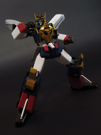 Estratto dalla confezione il chogokin trasmette subito una bella sensazione di rassicurante pesantezza, i 185 grammi distribuiti su 16 cm di altezza (calcolati all’apice delle due antenne ai lati della testa) non saranno da guinnes dei primati ma si difendono più che dignitosamente. Come in molti suoi predecessori, anche in questo Super Robot Chogokin la zama è concentrata quasi esclusivamente a livello degli arti inferiori, sono infatti di metallo i piedi e le parti esterne delle gambe mentre tutto il resto, con la sola eccezione del blocco dello snodo delle anche e della parte circolare esterna del diadema sul petto, è in plastica. La peculiare distribuzione dei pesi con localizzazione delle parti più pesanti negli arti inferiori ha nella notevole stabilità del modello anche nelle pose più estreme il suo vantaggio principale. Anche in questo caso, infatti (ma con i chogokin di questa serie la cosa non è ormai più una novità), abbiamo una posabilità al limite dell’impossibile, favorita dalle potenzialità estreme di praticamente tutti i punti di snodo del modello. Le articolazioni sono tutte ad attrito ma la cosa non dovrebbe porre problemi di tenuta neanche col passare degli anni viste le esigue sollecitazioni che gli snodi sono chiamati a sostenere soprattutto dal ginocchio in su, e cioè là dove il modello è più leggero. Analizzando nel dettaglio le giunture devo dire che ad una prima, superficiale valutazione, sono rimasto deluso dalle caviglie le quali parevano presentare movimenti molto limitati. In realtà è bastato dare un occhio al foglio di istruzioni per comprendere che gli snodi a questo livello sono estraibili tirando il piede in basso. Questo movimento cambia decisamente le carte in tavola facendo acquistare moltissimo soprattutto nell’inclinazione all’interno ed all’esterno del piede e di conseguenza alla posabilità dell’intero modello. Notevoli anche i movimenti di estensione del piede, favoriti dallo scorrimento dell’inserto bianco ancorato al dorso in una guida sulla faccia anteriore della gamba. Anche per il ginocchio è stato fatto un piccolo capolavoro tecnico. Come già osservato nello Zeorymer di questa stessa serie lo snodo del ginocchio è infatti articolato sia a livello della gamba (dove fa il grosso del movimento grazie anche alla concomitante mobilità dello sperone dorato) che all’attacco con la coscia dove assicura un supplemento di escursione tale da permettere alla gamba di flettersi totalmente sulla coscia con escursione fino a 180 gradi. In particolar modo quest’ultimo movimento è permesso dallo scorrimento delle due metà anteriore e posteriore della coscia l’una sull’altra, una interessantissima soluzione finora mai apprezzata in un chogokin ma solo a livello di kit. Altro snodo altra goduria: le anche consentono di realizzare praticamente tutti i movimenti desiderabili grazie anche alla mobilità, permessa da perni a sfera, dei tre elementi (anteriore, posteriore e laterale) del gonnellino in modo tale che essi non siano di impedimento. La coscia infatti può essere flessa ed abdotta a 90 gradi ed estesa quasi nella stessa misura nonché discretamente ruotata sull’asse longitudinale. Il tronco è dotato di due snodi, uno al passaggio bacino-addome (dove modula movimenti di torsione) e l’altro, estraibile, allo stacco addome-torace (dove invece regola la flessione in avanti del torace stesso, implementabile con l’estrazione dello snodo). Le spalle ruotano a 360 gradi ed hanno buone escursioni in flessione ed estensione. Questa ampia libertà di movimenti conferisce pertanto ottima posabilità anche a livello delle braccia permettendo quindi al gokin, per esempio, di impugnare a due mani le spade sollevandole sopra alla testa. Le braccia ruotano liberamente sull’asse longitudinale all’attacco con la spalla, lo stesso fanno gli avambracci al passaggio col gomito. Il gomito è flessibile ben oltre i 90 gradi mentre i polsi hanno discreti movimenti di inclinazione e di flessione-estensione (un po’ scocciante il fatto che per cambiare mano spesso il perno se ne venga via con la mano che si vuole sostituire e debba essere riapplicato). Il collo è dotato di due snodi a sfera, uno all’attacco col torace e l’atro all’aggancio con la testa. Questa soluzione implementa notevolmente la mobilità della testa garantendole rotazione a 360 gradi, inclinazioni laterali, estensione e flessione estreme. Anche i reattori del backpack sono mobili e parzialmente inclinabili. La verniciatura è nel complesso molto buona e curata, fatta eccezione per un paio di segni di distacco dalle sprue localizzati nella parte inferiore della faccia posteriore delle gambe e su qualche impugnatura delle spade (peccati veniali a onor del vero) non ho constatato particolari imperfezioni. Plastiche grigie un po’ discutibili quanto a qualità, sia a livello del backpack che degli elementi laterali del gonnellino. Senza infamia e senza lode gli accessori nonostante la discreta ricchezza in spade dell’armamentario anche se devo ammettere che impugnando lo spadone il modello risulta molto scenografico. Bella la lancia realizzabile dall’unione delle due spade dorate con l’apposito connettore.