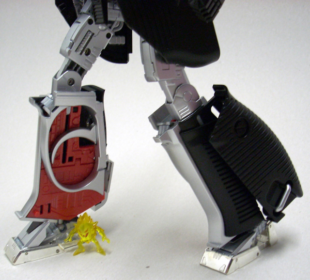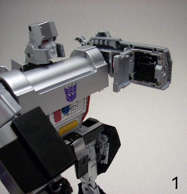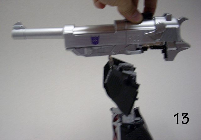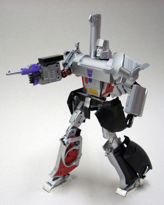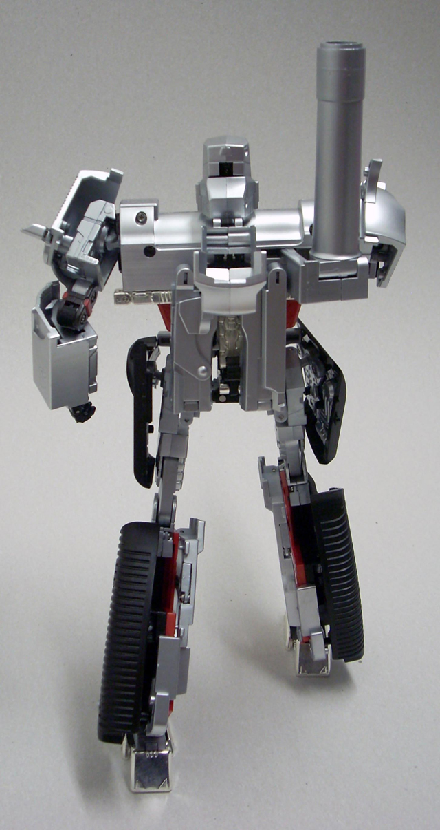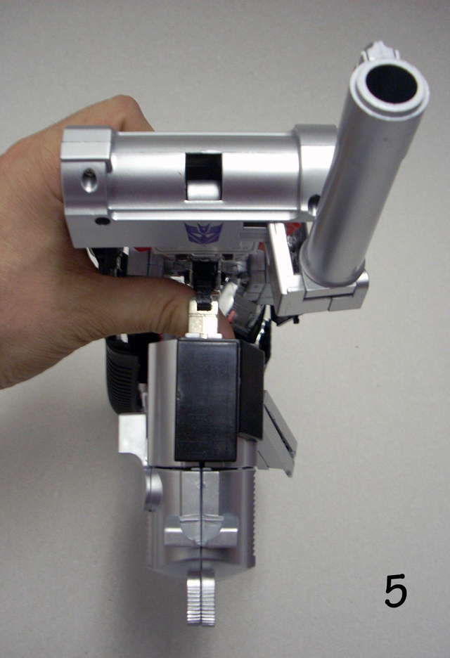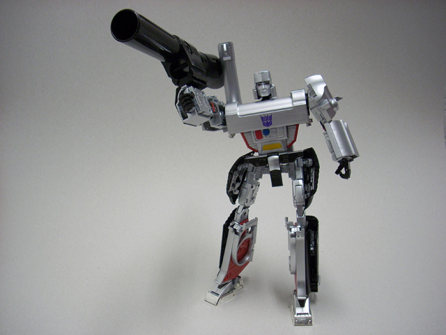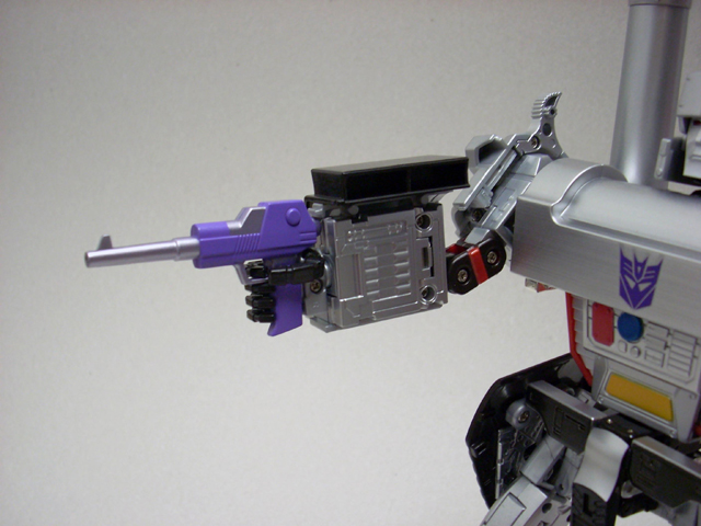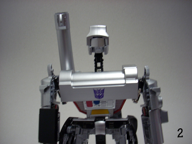 620gr x 32 cm di altezza il nostro Destron leader si caratterizza anche lui per la prevalente presenza di plastica e l' assenza quasi assoluta di zama.In perfetta scala con i precedenti pm 01/04 ne fanno un partner ideale in vetrina, diciamo uno step successivo obbligato.Pur non essendo uguale al 100% alla sua rappresentazione animata, non si fatica a riconoscerlo, serafica forse l' espressione facciale ma il mentone ed i ciglioni sono i suoi.Emozionanti gli occhi metallici rossi ed incastonati.Il robot pare ben proporzionato a parte la cronica magrezza delle gambe per via della trasformazione.A differenza dell' mp 01/04 non ho notato presenze di rimasugli di sprue palesemente evidenti, mentre critico le cromature che solo dopo due contatti tendono a opacizzare.La testa è dotata del classico giunto sferico nulla di particolare, mentre è simpatica la possibilità di modificare l' espressione facciale operando sull' elmo che alzandosi ed abbassandosi nasconde i ciglioni di Megatron.Articolazioni delle spalle sufficienti, limitate in abduzione ruotano comunque di 360 gradi.In prossimità dei gomiti, complice la trasformazione, si ha un doppio snodo sfruttabile anche per pose improbabili ma comunque al limite dell' accettabile.Il polso ruota e si torce leggermente mentre le dita sono articolate singolarmente.Il tronco è fisso senza nessuna possibilità di movimento ma la trasformazione regala a Megatron un bacino munito di balestra semirigida che gli dona la possibilità di flettersi lateralmente. (purtroppo anche più del dovuto e con il mirino/cannone sul braccio pende inesorabilmente sul suo peso.)Le gambe sono munite di ben 4 punti di snodo che in teoria permetterebbero infinite posizioni, limitate invero nella pratica dal peso del mirino se applicato al braccio e dalla misera capacità abduttiva donata dal balestrone nel bacino.Le caviglie sferiche permettono rotazioni a 360 gradi e la parte a copertura del piede consente di bloccarli in posizione.