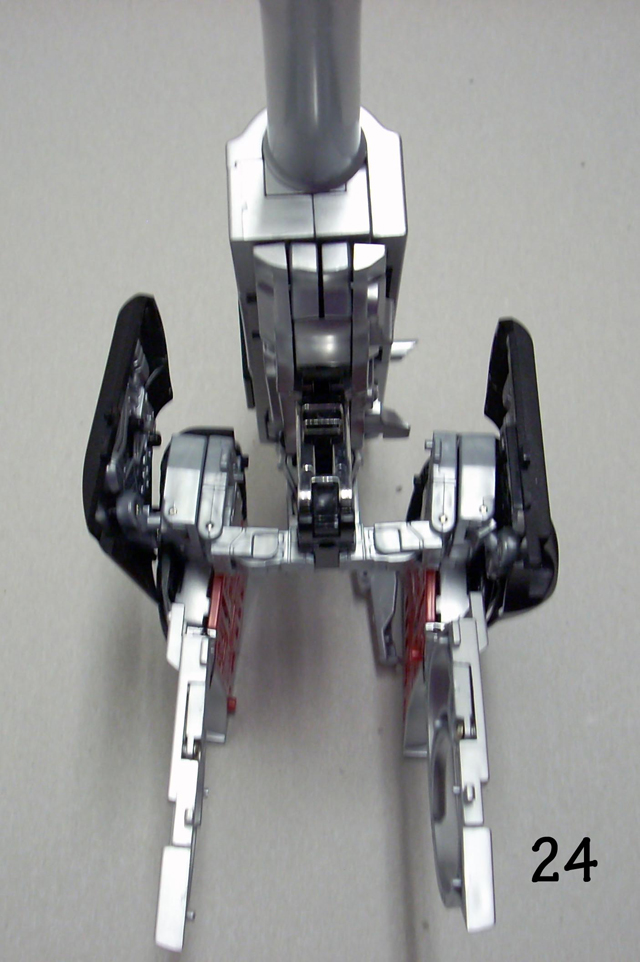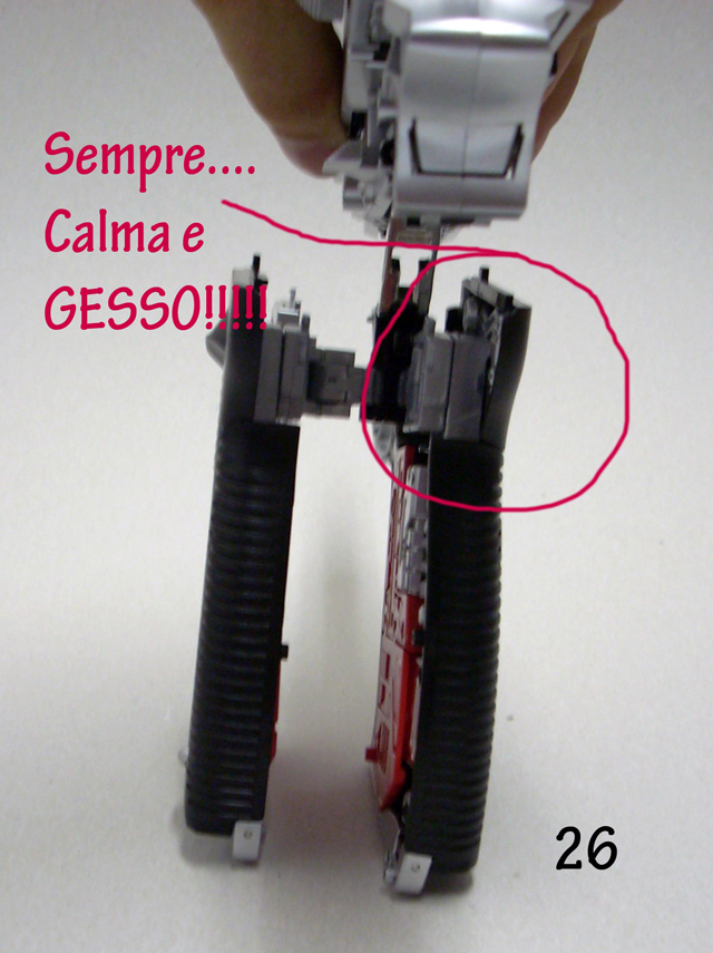 Una volta ripiegate le ginocchia su se stesse, premete sul quadratino nero mentre spingete le gambe all' interno del calcio.(fate la stessa cosa ma al contrario in fare di riconversione)Nelle foto tra la 21 e la 26 viene mostrato il corretto riposizionamento dei giunti delle gambe, è il momento più delicato fate attenzione.