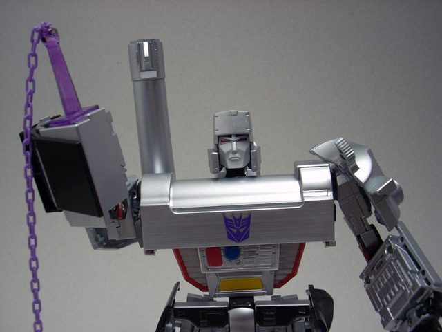 Un enorme blister in plastica racchiude il Megatron in forma umanoide, il mirino/cannone, una pistola vista nel lungometraggio a cavallo della seconda e terza stagione g1, una spada ed una mazza chiodata con catena.Tutte e tre le armi sono ben rifinite e verniciate, sia la spada che la pistola prevedono un fermo per assicurarle meglio nelle mani del Gattivone leggendario.Per utilizzare la mazza invece, come nel pm 01/04 si deve far rientrare una mano.In ultimo ma non per importanza: