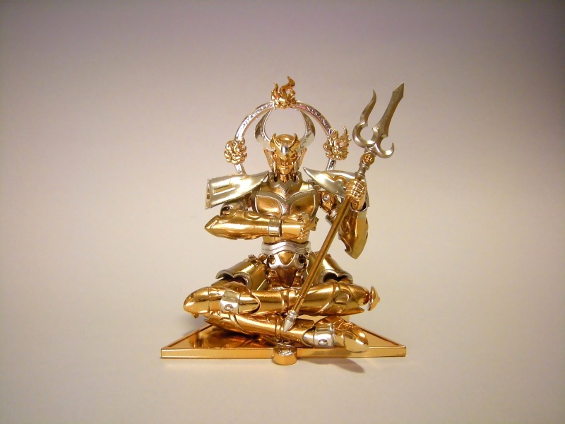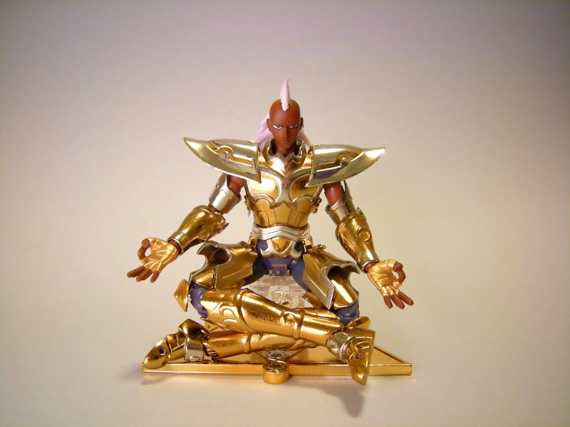 Essendo l’aspetto dell’object umano, non ci sono quasi differenze di posizionamento fra questo e il figurino di Krishna. La particolarità di questo soggetto è però di essere armato con una lancia. Nel mondo di Saint Seiya gli scontri sono quasi totalmente a mani nude, percui un personaggio armato rappresenta l’eccezione. La lancia di Chrysaor è divisa in due tronconi, dato che la sua lunghezza varia fra object e personaggio. La metà superiore dotata di lame è di metallo, mentre quella inferiore è di plastica: una scelta che seppur comprensibile ne mina un po’ l’effetto estetico, essendo evidente la differenza di colore fra le due componenti. Tuttavia non è questa l’unica caratteristica peculiare del personaggio, difatti si tratta dell’unico character in tutta la serie ad avere la pelle scura. Inoltre il torso del personaggio si presenta nudo per replicare la scena dell’anime quando, persa la parte superiore della sua armatura in battaglia, si siede in posa meditativa e scaglia il suo colpo più potente. È da notare che nella confezione è incluso un supporto trasparente per poter esporre il personaggio come se volasse a mezz’aria in posa meditativa, grazie all’ausilio di un display stand. Sulla carta si tratta di un’ottima intuizione, ma a conti fatti è piuttosto difficile mantenere le gambe incrociate mentre è sollevato da terra, perché queste tendono inesorabilmente a piegarsi verso il basso. Ovviamente in questo caso abbiamo anche il solito problema dello snodo alle anche, che non regge il peso della corazza delle gambe. Infine, la sua ultima particolarità è la pettinatura alla mohicana, che lascia quindi la fronte calva. Per applicare e togliere gli elmi ai myth, Bandai ha studiato un sistema di ciuffi opzionali che si adattino agli stessi. Tuttavia essendo Krishna privo di capelli l’aggancio a incastro non è quindi possibile, e la sua corona è dotata di listelli laterali che vanno a cingerne la testa. Una scelta che però si rivela inestetica osservando il personaggio di profilo. Ultima cosa, l’aureola presente nella conformazione object può essere applicata anche al personaggio (seguendo il suo aspetto nel manga) oppure no (seguendo il suo aspetto nell’anime).