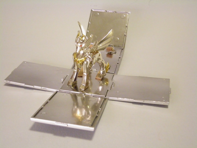 La scatola è una confezione a vetrinetta semplice, non essendoci abbastanza componenti da giustificare una confezione a libro. In dotazione al soggetto abbiamo anche una rappresentazione del cloth box, lo “zaino” metallico che i personaggi portano sulle spalle e che contiene la propria armatura. Al cloth box possono essere agganciate delle cinghie di cuoio per permettere al personaggio di trasportarlo, è apribile su tutti e quattro i lati ed è perfino totato della maniglia d’apertura, posta nella bocca dell’effige del Pegaso sul suo fronte. È presente anche una miniatura della cloth di Pegasus (v2) in conformazione object che può essere riposta all’interno del box. Il personaggio di Seiya è un corpo g3, quindi snodabilissimo. L’unica particolarità a cui fare attenzione è che i piedi del personaggio, rappresentanti le classiche sneakers bianche e rosse, sono in plastica in luogo dei piedi metallici dei myth regolari. Questo dettaglio rende il soggetto più instabile rispetto alle versioni armate, dato che non ha alcun peso che lo ancori per bene a terra. Per il resto c’è da notare come il figurino sia dotato di veri vestiti opzionali. Sotto di essi il personaggio è nudo (ad eccezione del bacino, colorato di rosso). La fattura di questi abiti è il vero tallone d’achille del prodotto. Se ai tempi dei prototipi Bandai presentò dei vestiti calzanti a pennello al figurino, nel prodotto finito ci troviamo invece dei pantaloni sovradimensionati e un po’ flosci. Dal punto di vista estetico è sicuramente un punto a sfavore, ma all’atto pratico questa abbondanza permette una migliore posabilità del personaggio, che sarebbe stata invece limitata da dei vestiti troppo aderenti. Nella confezione sono presenti anche due cinghie lunghe, atte a legare assieme i cloth box di Pegasus e Dragon per riprodurre la scena dell’anime/manga originale dove Seiya trasporta entrambi gli scrigni. A completare il set è presente anche un curioso disco da applicare sui display stand. Nonostante il cloth box sia di plastica infatti, una volta indossatolo sulla schiena la stabilità del personaggio è comunque precaria. Ecco quindi che il disco diventa un basamento su cui appoggiare il cloth box, esponendo il personaggio nell’atto di trasportarlo.