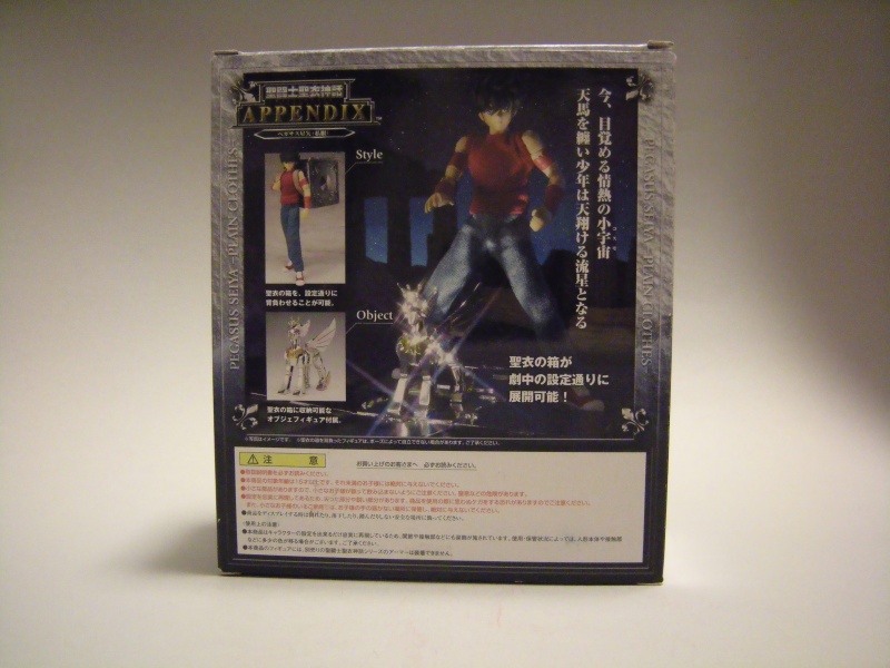 A sorpresa Bandai arricchisce la linea Appendix inserendo dei personaggi con i loro abiti civili, in luogo delle classiche armature. Ad aprire le danze è ovviamente il solito Pegasus Seiya. Null'altro da dire, se non che questi sono i vestiti che Seiya indossa quando non combatte.