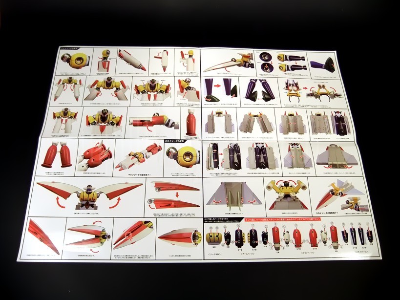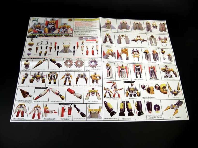 La scatola è interamente occupata da un grosso contenitore in polistirolo all’interno del quale trovano alloggiamento i vari componenti separati nei singoli segmenti. Sul versante principale, chiuso da un tappo in polistirolo, troviamo pertanto, contenuti ciascuno nella relativa bustina protettiva di plastica trasparente: un busto scomposto in testa, torace, addome e bacino; le earth parts suddivise in gambe, cosce, ruote dentate, braccia e trivelle; le sky parts divise in gambe, cosce, ali, missili e modulo di volo; le gambe, cosce, braccia, missili subacquei ed avambracci delle marine parts. Sul versante opposto al vano principale troviamo, contenuti nella relativa busta di plastica ed ancorati al polistirolo con una semplice striscia di scotch, i due busti aggiuntivi (già composti ed in tutto e per tutto uguali, quindi calamitati, a quello reperibile sul lato principale) e le griglie a supporto dei tappi coprivite (per quanto riguarda questi ultimi non credo che sarebbe stato chissà quale problema aggiungere i tappi per i busti aggiuntivi, che viceversa non sono stati inseriti). Le istruzioni, come da tradizione CM’S, sono sintetizzate sull’abituale, sbrigativo foglio a colori piegato in quattro parti e stampato su entrambe i lati (a quando un bel libretto in stile Bandai o Max Factory? Attendiamo risposta anche da Fewture…..)
