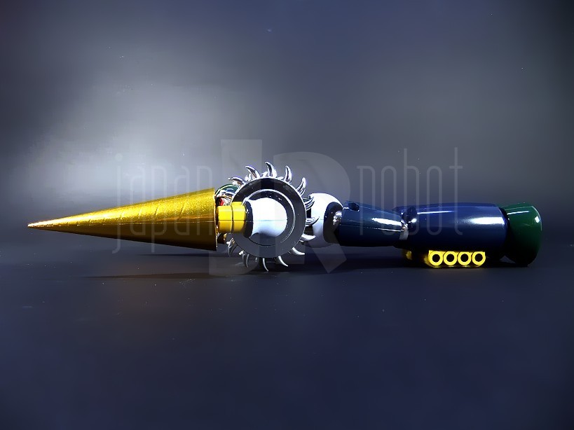 Partiamo col dire che se acquistate il modello e già possedete il Brave Gokin 36, potete scordarvi un busto analogo a quello del suddetto gokin, e cioè ricco di metallo ben pesante e lucente. I tronchi a corredo di questo Brave Gokin, verosimilmente per motivi di stabilità, sono infatti stati realizzati interamente in plastica, e si vede, non solo per il peso….. Per accettabili e ben verniciati che siano, infatti la differenza è abbastanza chiara, già a partire dal colore del torace che tradisce molto chiaramente la composizione in plastica. Insomma, il giallo non è certo quel bel colore vivace tipico del metallo verniciato che abbiamo potuto apprezzare nel Jeeg, ma risulta decisamente più smorto. Se possedete entrambi i modelli vi invito a fare questo confronto. Nelle Earth Parts (missili superperforanti in italiano) sono di metallo le cosce e le braccia, tutto il resto (piedi e gambe, trivelle, ruote dentate e tronco) è in plastica. Il peso alla fine e tutto sommato, per una altezza di 16.5 cm, non è neanche così male (295 grammi, principalmente conferiti dalle cosce che insieme da sole ne costituiscono oltre un quarto). La verniciatura sia per le parti metalliche che per quelle plastiche, come da tradizione CM’S, è ben curata e soddisfacente, così come lo sono alcuni dettagli (vedi i nastri cingolati mobili in gomma sulla parte anteriore delle gambe, anche se trasmettono una certa sensazione di fragilità...). Anche la differenza cromatica tra parti a composizione diversa ma dello stesso colore (leggi gambe e cosce) tutto sommato non si apprezza molto se non nel differente grado di opacità dei materiali. Discutibile la scelta dell’oro opaco per la verniciatura delle trivelle. La stabilità è abbastanza buona, e la notizia non è da sottovalutare viste le esperienze dei passati magnetici CM’S (Jeeg compreso). Di fatto la sensazione è che in questo caso si debba giocare con gli equilibri del modello molto meno di quanto non si sia chiamati a fare con i precedenti calamitati CM’S per dare stabilità alle pose, complice la superficie d’appoggio gommata dei piedi. Viene comunque da chiedersi perché i pesi siano stati distribuiti in modo così apparentemente irrazionale. In altre parole mi domando (senza peraltro trovare una risposta se non nell’abbattimento dei costi di produzione) perché non si siano volute realizzare anche le gambe e i piedi in metallo, cosa che, oltre ad essere fattibilissima, avrebbe conferito una stabilità ancora migliore al modello (e dato maggior soddisfazione a noi collezionisti). Per quanto riguarda le articolazioni ve ne sono pochissime a scatto (fanno eccezione le spalle dove oltre alla calamita intervengono i dentini che, sulle ruote dentate, si ingranano con quelli delle spalle). Se infatti è intuitivo come i punti di snodo calamitati debbano essere giocoforza ad attrito, trovo poco condivisibile l’uso di semplici snodi a sfera a livello delle caviglie (se si tirano i piedi si staccano tranquillamente) dove l’articolazione a scatto avrebbe potuto offrire maggior stabilità e tenuta nel tempo. La posabilità nel complesso è modesta, le caviglie si inclinano poco e le ginocchia non arrivano a piegarsi neanche a 45 gradi. Le anche avrebbero potenzialmente dei buoni movimenti di abduzione nonché di flessione ed estensione, ma tutto viene praticamente vanificato dall’ipomobilità delle articolazioni poste a valle. Il tronco ha modesti movimenti di torsione al passaggio addome-bacino e di inclinazione allo stacco bacino-torace. La testa ha escursioni limitate in torsione laterale (così come nel Jeeg) e discreta estensione (fondamentale in questo caso per la simulazione delle pose in assetto orizzontale). Le ruote dentate possono ruotare e si è scelto di realizzarle con le punte su di esse direzionate in senso opposto (anche se nell’anime a onor del vero avevano inclinazione analoga o opposta a seconda del fotogramma). Nella parte interna della loro porzione bianca sono riportate delle lettere, in alto rispettivamente L (left) e R (right) per dare indicazioni sul lato di applicazione ed in basso, su entrambe, le lettere F (front) e R (rear) per suggerire quale parte posizionare frontalmente e quale posteriormente. Le spalle, che si agganciano sul tronco con un sistema calamitato, si articolano con le ruote dentate grazie a dei dentini di plastica analoghi alla soluzione già adottata nel Jeeg. Si abducono con un sistema a scatto a 90 gradi e ruotano liberamente a 360 gradi. Le trivelle, dotate di calamite, si agganciano agli avambracci con un sistema ad incastro con la costante conseguenza che, quando le si rimuove la calamita resta regolarmente attaccata al braccio stesso.