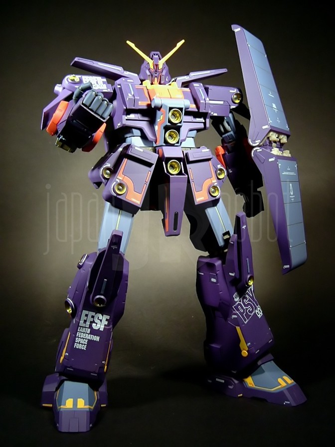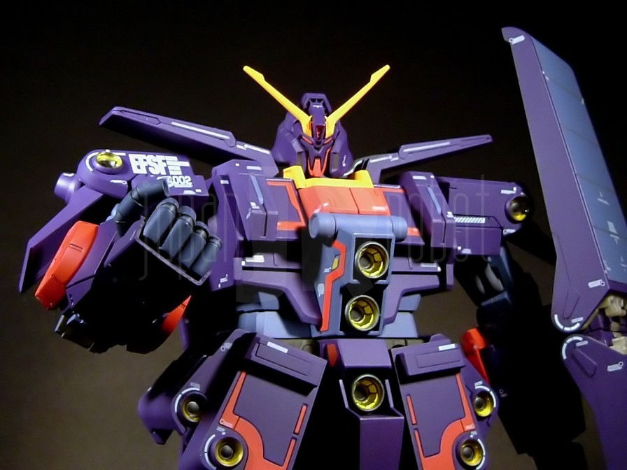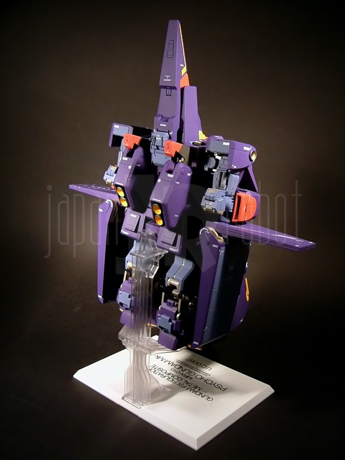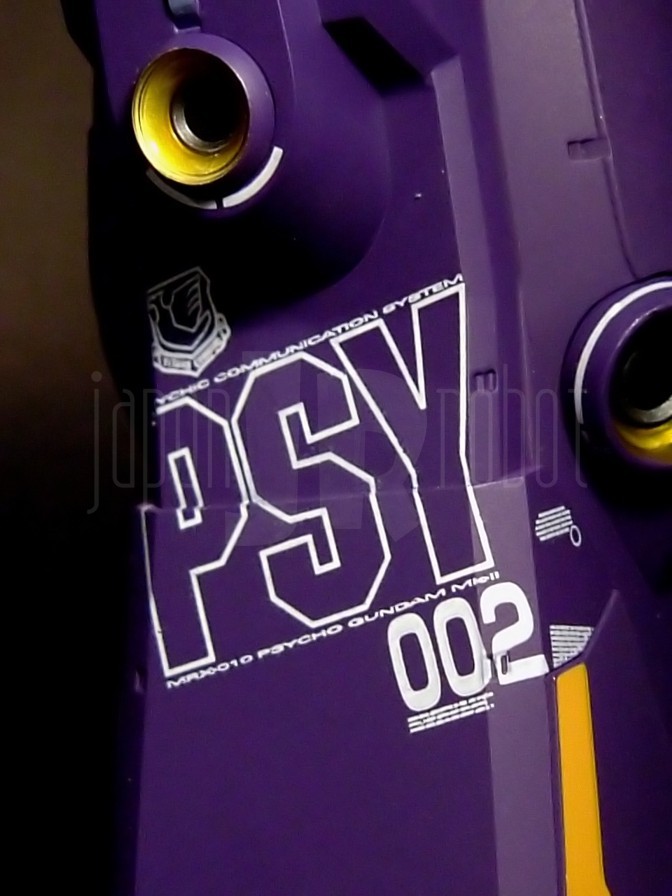 Pur non essendo un macigno il nostro Psycho si caratterizza per il fatto di essere probabilmente il più Metal tra i vari Metal Composite. Se infatti tale definizione è spesso considerata un'esagerazione visto l'esiguo contenuto in parti metalliche dei soggetti riprodotti per questa serie, in questo caso, nonostante la corazza esterna sia come al solito interamente in plastica, sono ben evidenti le componenti in zama che si rivelano in modo chiaro nel corso della conversione a fortezza volante concentrandosi principalmente in corrispondenza dello scheletro delle gambe, degli snodi di ginocchia, anche e spalle e parzialmente all'interno del tronco per un peso complessivo di 724 grammi che, se per un modello di 29 cm (ebbene si, sono 29 cm di altezza all'apice del fregio) è relativamente contenuto, nel complesso non risulta comunque così esiguo. La posabilità del modello, come nel suo predecessore, è molto limitata, in queso caso forse ancora di più. La cosa fortunatamente non disturba più di tanto data la relativa staticità della controparte animata. Le caviglie hanno buoni movimenti di inclinazione laterale ma scarsa capacità di flessione. Purtroppo le discrete escursioni laterali sono parzialmente vanificate dalla modesta abduzione delle anche. In parte si può ovviare a questo inconveniente tramite la rotazione laterale dell'intero arto inferiore (movimento consentito a livello dell'anca) in modo da permettere alle gambe di divaricarsi un po' di più. Le ginocchia, unica articolazione a scatto del modello, si flettono a non più di 30 gradi. I sei elementi del gonnellino (2 anteriori, 2 laterali, 2 posteriori) sono mobili grazie alla presenza di piccoli perni snodati che li ancorano al bacino. Il tronco è un blocco unico e privo di snodi, cosa intuibile dati i limiti imposti da una trasformazione che ne richiede la completa apertura. Le spalle ruotano totalmente ed hanno modestissimi movimenti di abduzione. Le braccia sono rotabili di 360 gradi sull'asse longitudinale ed i gomiti si flettono a 90 gradi. Gli avambracci sono staccabili permettendo così la simulazione delle beam swords (nell'anime venivano usati come armi a distanza sparabili che rimanevano ancorati alle braccia tramite cavi). Carino il fatto che la testa sia sganciabile proprio come nell'anime, è regolata da un perno che si articola alla base della testa con un sistema a sfera agganciandosi all'estremo opposto al tronco con un attacco calamitato. Ha movimenti limitatissimi, sia lateralmente quanto in flessione. Il fregio sulla fronte è intercambiabile, quello che troviamo già montato è di pvc morbido ed è questo che consiglio di tenere inserito per minimizzare il rischio di antipatiche rotture. L'altro fregio montabile ha invece il vantaggio di non piegarsi essendo in plastica rigida ma proprio per questo è a maggior rischio di eventuali rotture accidentali. Le mani sono appena due paia (due pugni chiusi e due con dita snodate a livello dell'attacco alla mano). Entrambe hanno perni snodati alla loro base così da permettere i movimenti di flessione rispetto all'avambraccio. La trasformazione in fortezza volante è tecnicamente concepita in modo ineccepibile, non si discosta minimamente dalla analoga conversione praticabile nel suo predecessore e come in quel caso, una volta ultimata, lascia molto dubbiosi sull'estetica di quanto ottenuto con tanta ingegnosa maestria. In altre parole, così come l'MRX-009, in MA mode anche l'MRX-010 somiglia a qualcosa di più simile ad un climatizzatore portatile che non a una minacciosa base volante. La raccomandazione sempre valida rimane comunque quella, qualora si volesse praticare la conversione (ne può sicuramente valere la pena almeno per valutare il validissimo lavoro ingegneristico fatto da Bandai), di fare molta attenzione nello sfregamento delle varie parti che inevitabilmente si viene a verificare, pena il rischio di fastidiosisime rigature della vernice. La verniciatura, appunto! Proprio questa è a mio modo di vedere il vero punto di forza del nostro modello. Bellissimo l'accostamento dei 4 colori dominanti (viola, rosso, giallo, azzurro) per un risultato cromatico decisamente accattivante e valorizzato dall'estrema precisione con cui sono stati curati anche i più piccoli dettagli, dalle pannellature degli inserti rossi alle markerizzazioni più minute che un po' ovunque impreziosiscono lo Psycho, il tutto in assenza di grossolani difetti. Bruttina invece la parte centrale dello scudo dove, una volta unite le due metà, sono evidenti elementi grigi non verniciati che stonano e non poco con la colorazione viola delle parti circostanti. Un peccato, visto e considerato che verniciatura a parte si tratta comunque di un prodotto asai curato anche in tutti gli altri dettagli, vedi i tappi coprivite sulla superficie interna delle cosce.