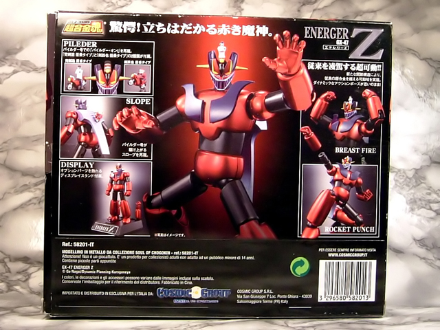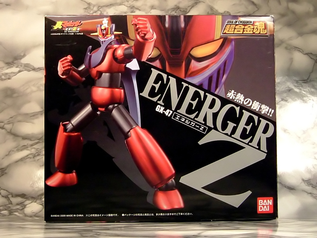 Dopo la parentesi del bellissimo gx-46 direttamente tratto da Super Robot Wars Bandai torna ad attingere a piene mani dai mecha della serie Shin Mazinger Shougeki! Z Hen con la produzione,dopo l'uscita targata 2008 di Energer e Iron Z, di un nuovo Energer, lo Shin Energer Z così come il robot compare facendo una fugace apparizione nel ventunesimo epidosio della serie per essere rapidamente liquidato dal Mazinga Z trasformatosi in Big Bang Punch. La caratteristica più peculiare del modello è certamente la colorazione, non analoga a quella dei precedenti gx-07E ed I o a quella dell'Energer così come appare nell'episodio 20, ma ben diversa e derivante dall'arroventamento del robot quando il Conte Brocken alla sua guida mostra la sua vera identità gettando la maschera di Kenzo Kabuto con cui si era camuffato. Ci troviamo di fronte ad un modello che sinceramente ho comprato soprattutto per il prezzo stracciato a cui mi è stato proposto e per la colorazione a dir poco originale che in un certo qual senso si discosta dall'abituale piattume mazinghiano, ma non possiamo nascondere come anche questa, come quella dei vari 07E ed I, rappresenti l'ennesima operazione Bandai di chiaro riciclaggio di modelli già usciti (in questo caso del recente gx-45). Andiamo quindi ad analizzare questo ennesimo clone bandaiano......