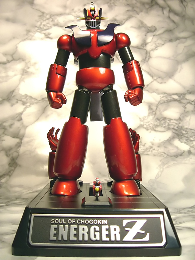 Strutturalmente è analogo al gx-45, per cui da esso non differisce ne' in altezza (16 cm) ne' in peso (340 grammi). Le uniche parti in plastica sono piedi, avambracci e testa, tutto il resto è di metallo. La posabilità, come per il gx-45, è a livelli estremi: le caviglie, estraibili, hanno ampissime escursioni e le ginocchia, a scatto, si flettono oltre i 90 gradi consentendo pose in ginocchio. Il sistema articolare delle anche ha la struttura ormai sdoganata da Bandai col precedente Mazinga Z e che prossimamente rivedremo nel gx-51 Getter Dragon ed è costituito da due snodi a sfera in parte abbassabili così da assicurare ampi movimenti laterali e grosse escursioni in ogni direzione. L'addome ruota rispetto al bacino ed il torace si flette sull'addome oltre ad avere movimenti di basculamento laterale. Le spalle, a scatto, hanno totale libertà di movimento ed i gomiti, ad attacco calamitato, si flettono oltre i 90 gradi. A differenza del gx-45 che presentava nella eccessiva lassità in rotazione degli avambracci sulle braccia uno dei difetti principali, nel mio esemplare di Energer non ho rilevato tale difetto e l'articolazione ha presentato una tenuta sufficiente. Belli i polsi, ben snodati e tali da permettere ampi movimenti di flessione ed estensione. La testa si flette ed estende ampiamente e ruota liberamente a 360 gradi. La verniciatura del modello rappresenta in verità il suo reale punto di forza. Inizialmente mi ha lasciato interdetto ma con il tempo, una volta che l'occhio si è abituato e dopo aver visto i relativi episodi dell'anime, devo ammettere che ha finito per piacermi sempre di più. Le foto in realtà non rendono ragione alla sua bellezza, apprezzabile solamente osservando il modello dal vivo. Il rosso scuro metallizzato di gambe, avambracci, bacino e torace, si accosta perfettamente al viola delle piastre pettorali e al colore di addome, cosce e braccia, una via di mezzo tra un grigio antracite ed un nero brunito metallizzato. In questo insieme di colri risulta azzeccato anche il giallo degli occhi e degli inserti sulla testa. Nel mio esemplare non ho notato difetti particolari di verniciatura se non la presenza di piccoli segni di distacco dalle sprue sul margine inferiore della faccia posteriore dei piedi. Le miniature, data la esiguità di dimensioni sono tutto sommato ben realizzate anche se, volendo fare i pignoli, solo quella di Kenzo Kabuto ha senso dal momento che nell'anime Tetsuya non monta mai a bordo di un Energer con questi colori ma bensì con i colori classici (quelli dello 07E tanto per intenderci). Il set di accessori è relativamente scarno,