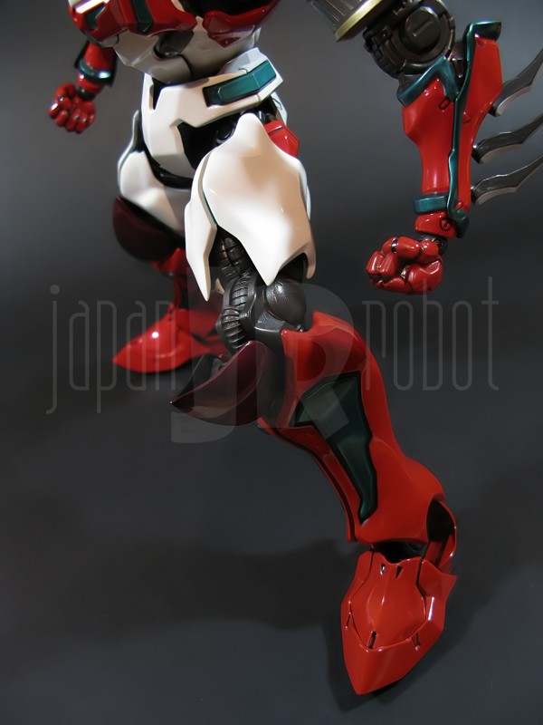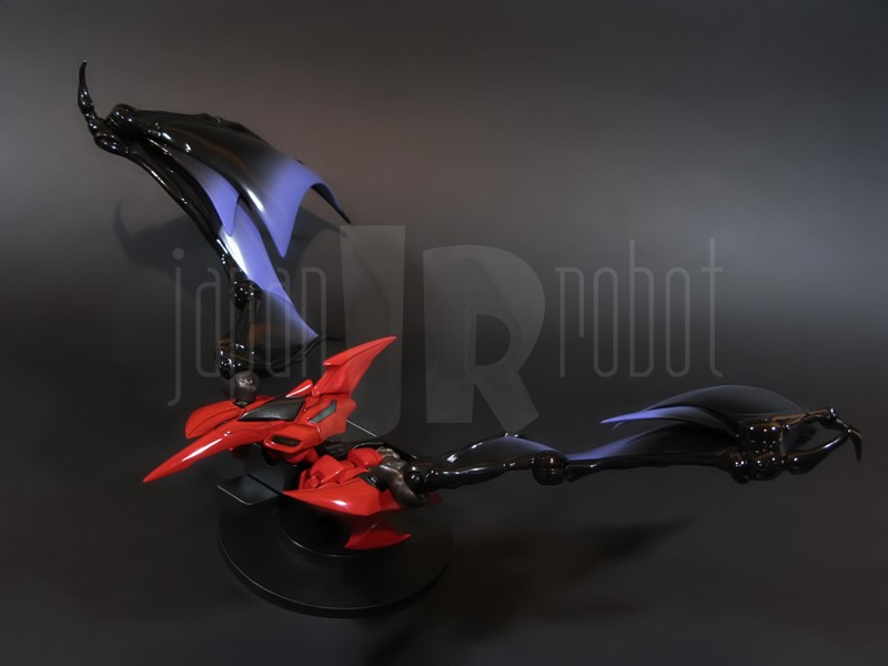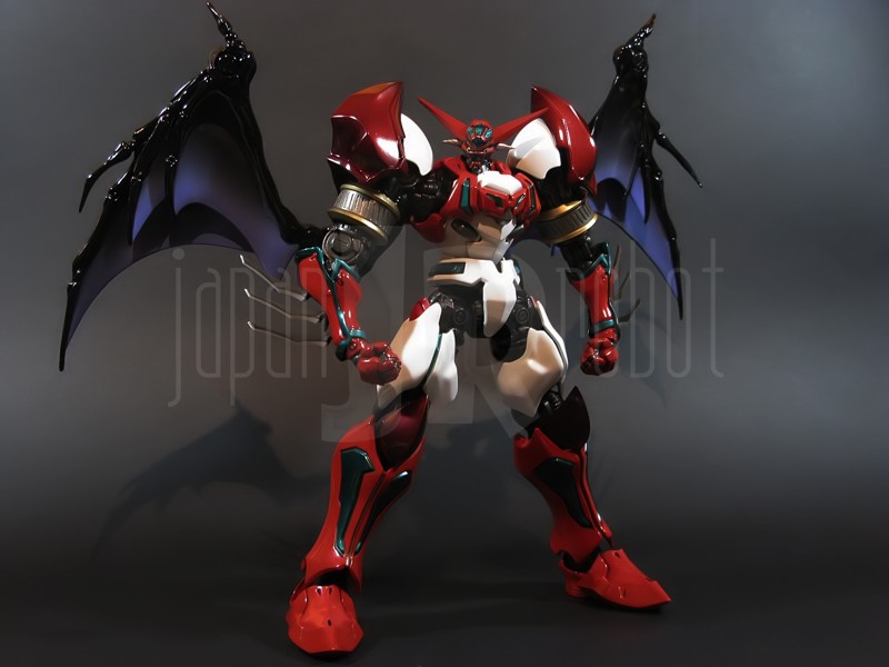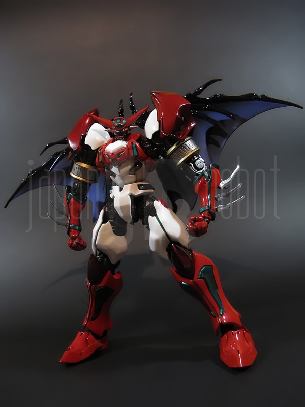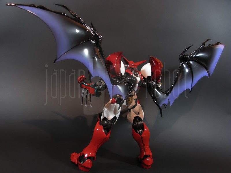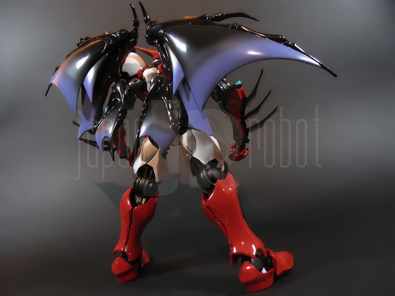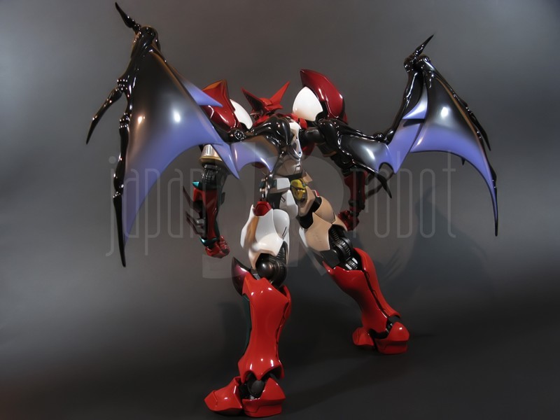 Come si estrae il modello e lo si soppesa se ne evince la abituale, estremamente lusinghiera e soddisfacente sensazione di pesantezza che caratterizza tutti i gokin di questa serie, già di per se indicativa di una composizione quasi integralmente in metallo. Fatta eccezione per testa, pugni, ginocchiere, dischi sulle braccia e giunture e ingranaggi a vista (vedi anche, spalle e gomiti), il nostro Shin Getter 1 è infatti totalmente in lega metallica, almeno per quanto riguarda le parti esposte. La politica adottata, anche per la strutturazione di questo modello così come per i precedenti Getter Fewture, è stata quella dello scheletro in plastica di sostegno ad un rivestimento esterno in zama, aspetto che non lascerebbe presagire niente di buono visti i problemi dei famigeratissimi predecessori, tanto criticati per falle più o meno clamorose (Getter 1 e Getter 2 in particolar modo) anche se in questo caso mi sento di essere più fiducioso visto l’uso di plastiche apparentemente più solide e di miglior qualità e l’impiego di viti (indicato dalla presenza di azzeccatissimi tappi ben visibili sulla schiena del robot) a solidificare la struttura del gokin. L’assemblaggio è estremamente semplice e rapido, è sufficiente applicare a pressione le lame sugli avambracci (ciascuna mobile in modo indipendente e regolata da uno snodo a sfera), la testa, il generatore getter, le due piastre pettorale e addominale, le ali e le due ginocchiere. Una volta assemblato il modello (completo di ali), ha un peso di 1060 grammi per un’altezza all’apice delle spalle di 26 cm scarsi che arriva ad un culmine di circa 43 cm alla punta delle ali se rivolte verso l’alto. La mobilità del modello è semplicemente eccezionale e garantita da un’infinità di punti di snodo che consentono anche le pose più estreme (vedi la possibilità di metterlo in ginocchio) a dispetto delle forme relativamente elaborate e della stazza decisamente imponente. L’avampiede è flessibile con movimento a scatto, le caviglie hanno discreta inclinazione e modesta rotazione lavorando in tal senso come articolazioni ad attrito e funzionando invece con sistema a scatto in estensione (peraltro buona). Le gambe ruotano leggermente lungo l’asse longitudinale (la sinistra del mio in realtà era bloccata ed ha necessitato di una piccola iniezione di lubrificante). Le ginocchia sono estremamente flessibili e regolate da snodi a scatto, il consiglio è quello di porre particolare attenzione ai rischi di sverniciatura nelle flessioni estreme, quando cioè la parte superiore della faccia posteriore della gamba rischia di andare in contatto con la parte bassa della faccia posteriore della coscia. L’articolazione dell’anca presenta ottime escursioni sia in abduzione che in flessione, agendo su ambo i piani con sistema a scatto. L’intero arto inferiore è peraltro abbondantemente intra ed extrarotabile all’altezza della coscia. Buoni i basculamenti laterali del torace, più limitati i movimenti di torsione, ad ogni modo occhio alle eventuali sverniciature della piastra pettorale nel caso di contatto col bacino, rischio da cui lo stesso foglio delle istruzioni mette in guardia. Le spalle sono ripiegabili in avanti ed estensibili posteriormente con sistema ad attrito mentre in rotazione (peraltro completa) ed in abduzione (pari a non più di 90 gradi) lo snodo si comporta come articolazione a scatto. Gli stessi inserti marroni sulle spalle sono mobili e ripiegabili medialmente a scatto. I gomiti, anch’essi a scatto, si flettono a circa 90 gradi, mentre gli avambracci sono liberamente ruotabili lungo il loro asse longitudinale. Addirittura i polsi (forse un po’ troppo esilini) sono a scatto e danno la possibilità di flessioni estreme alla mano. La testa è invece supportata da uno snodo a sfera che, oltre a consentire la rotazione completa a 360 gradi, permette ottimi movimenti di flessione ed estensione anche per effetto della mobilità della base di impianto. Nel complesso, oltre all’ottima posabilità, è confortante constatare la ricchezza di articolazioni a scatto, teoricamente in grado di garantire una maggiore tenuta in prospettiva futura, fondamentale per un gokin così pesante rispetto ai più semplici e col tempo logorabili snodi ad attrito. La qualità della verniciatura è nel complesso estremamente buona, comunque più alta, almeno in questo esemplare, rispetto alla media da me rilevata nei precedenti Ex Gokin. Se infatti si escludono alcuni ritocchi di vernice bianca sulla schiena (difetto peraltro lamentato anche in altre copie e da più di una persona) e piccole imperfezioni degli inserti verdi sulle gambe per il resto non ho dovuto registrare altri problemi di seppur minimo rilievo ma ho trovato anzi molto bella la tonalità di verde smeraldo tenuemente metallizzato impiegata e soprattutto stupende le sfumature del marrone metallizzato di ginocchia e spalle. Sempre rimanendo in tema di verniciatura non ho invece ben compreso, pur trovandola bella, la colorazione invecchiata in stile weathering delle varie paia di mani che però tendono a stonare su di un modello per il resto completamente “pulito”, ivi compresi gli accessori. Quanto all’estetica il giudizio per questi modelli più che per altri diventa difficile ed opinabile essendo strettamente legato al gusto personale ed indipendente dalle necessità di somiglianza ad una controparte animata in questo caso inesistente. Personalmente trovo che questo Shin Getter 1 abbia linee discretamente azzeccate seppur migliorabili, in particolar modo dalla cintura in giù, là dove avrei cioè auspicato un rapporto coscia-gamba più vicino al soggetto ispirante con gamba più massiccia e coscia più sottile a differenza dell’aspetto da simil culturista che una coscia eccessivamente ipertrofica, in associazione a una gamba troppo snella, tendono a conferirgli. Fa invece discutere riportando alla memoria alcuni mostri tipici della mitologia giapponese, la s