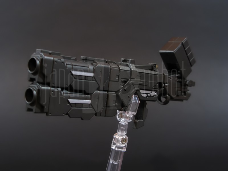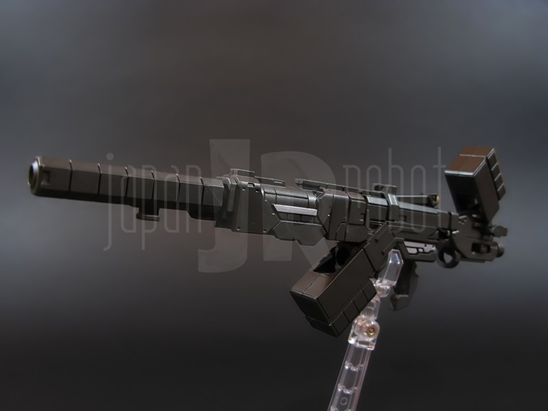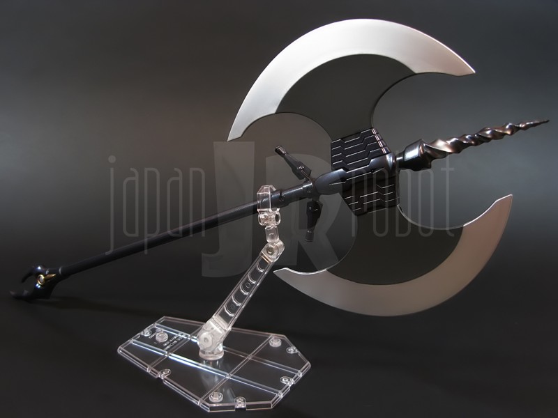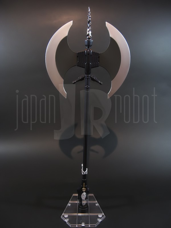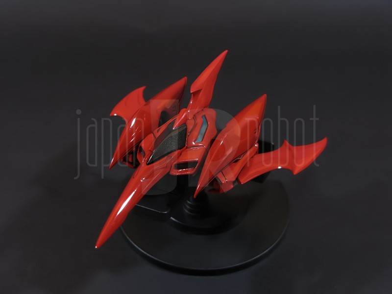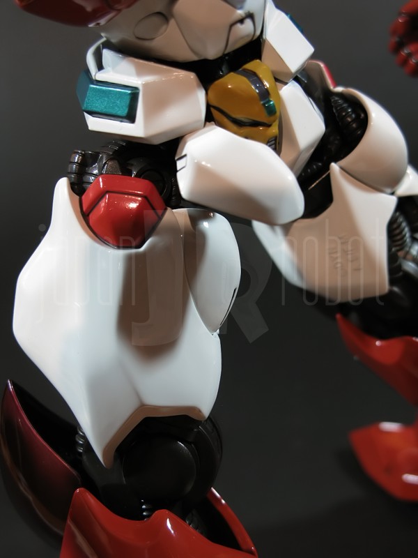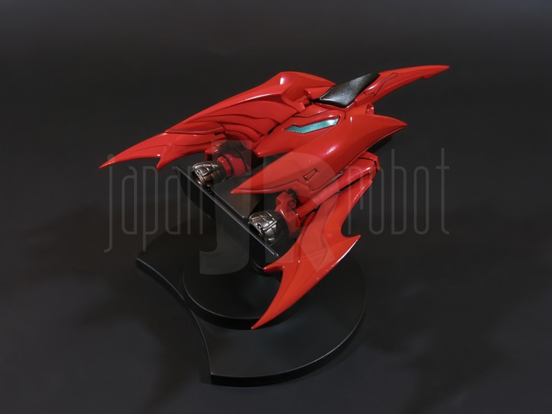 Come si estrae il modello e lo si soppesa se ne evince la abituale, estremamente lusinghiera e soddisfacente sensazione di pesantezza che caratterizza tutti i gokin di questa serie, già di per se indicativa di una composizione quasi integralmente in metallo. Fatta eccezione per testa, pugni, ginocchiere, dischi sulle braccia e giunture e ingranaggi a vista (vedi anche, spalle e gomiti), il nostro Shin Getter 1 è infatti totalmente in lega metallica, almeno per quanto riguarda le parti esposte. La politica adottata, anche per la strutturazione di questo modello così come per i precedenti Getter Fewture, è stata quella dello scheletro in plastica di sostegno ad un rivestimento esterno in zama, aspetto che non lascerebbe presagire niente di buono visti i problemi dei famigeratissimi predecessori, tanto criticati per falle più o meno clamorose (Getter 1 e Getter 2 in particolar modo) anche se in questo caso mi sento di essere più fiducioso visto l’uso di plastiche apparentemente più solide e di miglior qualità e l’impiego di viti (indicato dalla presenza di azzeccatissimi tappi ben visibili sulla schiena del robot) a solidificare la struttura del gokin. L’assemblaggio è estremamente semplice e rapido, è sufficiente applicare a pressione le lame sugli avambracci (ciascuna mobile in modo indipendente e regolata da uno snodo a sfera), la testa, il generatore getter, le due piastre pettorale e addominale, le ali e le due ginocchiere. Una volta assemblato il modello (completo di ali), ha un peso di 1060 grammi per un’altezza all’apice delle spalle di 26 cm scarsi che arriva ad un culmine di circa 43 cm alla punta delle ali se rivolte verso l’alto. La mobilità del modello è semplicemente eccezionale e garantita da un’infinità di punti di snodo che consentono anche le pose più estreme (vedi la possibilità di metterlo in ginocchio) a dispetto delle forme relativamente elaborate e della stazza decisamente imponente. L’avampiede è flessibile con movimento a scatto, le caviglie hanno discreta inclinazione e modesta rotazione lavorando in tal senso come articolazioni ad attrito e funzionando invece con sistema a scatto in estensione (peraltro buona). Le gambe ruotano leggermente lungo l’asse longitudinale (la sinistra del mio in realtà era bloccata ed ha necessitato di una piccola iniezione di lubrificante). Le ginocchia sono estremamente flessibili e regolate da snodi a scatto, il consiglio è quello di porre particolare attenzione ai rischi di sverniciatura nelle flessioni estreme, quando cioè la parte superiore della faccia posteriore della gamba rischia di andare in contatto con la parte bassa della faccia posteriore della coscia. L’articolazione dell’anca presenta ottime escursioni sia in abduzione che in flessione, agendo su ambo i piani con sistema a scatto. L’intero arto inferiore è peraltro abbondantemente intra ed extrarotabile all’altezza della coscia. Buoni i basculamenti laterali del torace, più limitati i movimenti di torsione, ad ogni modo occhio alle eventuali sverniciature della piastra pettorale nel caso di contatto col bacino, rischio da cui lo stesso foglio delle istruzioni mette in guardia. Le spalle sono ripiegabili in avanti ed estensibili posteriormente con sistema ad attrito mentre in rotazione (peraltro completa) ed in abduzione (pari a non più di 90 gradi) lo snodo si comporta come articolazione a scatto. Gli stessi inserti marroni sulle spalle sono mobili e ripiegabili medialmente a scatto. I gomiti, anch’essi a scatto, si flettono a circa 90 gradi, mentre gli avambracci sono liberamente ruotabili lungo il loro asse longitudinale. Addirittura i polsi (forse un po’ troppo esilini) sono a scatto e danno la possibilità di flessioni estreme alla mano. La testa è invece supportata da uno snodo a sfera che, oltre a consentire la rotazione completa a 360 gradi, permette ottimi movimenti di flessione ed estensione anche per effetto della mobilità della base di impianto. Nel complesso, oltre all’ottima posabilità, è confortante constatare la ricchezza di articolazioni a scatto, teoricamente in grado di garantire una maggiore tenuta in prospettiva futura, fondamentale per un gokin così pesante rispetto ai più semplici e col tempo logorabili snodi ad attrito. La qualità della verniciatura è nel complesso estremamente buona, comunque più alta, almeno in questo esemplare, rispetto alla media da me rilevata nei precedenti Ex Gokin. Se infatti si escludono alcuni ritocchi di vernice bianca sulla schiena (difetto peraltro lamentato anche in altre copie e da più di una persona) e piccole imperfezioni degli inserti verdi sulle gambe per il resto non ho dovuto registrare altri problemi di seppur minimo rilievo ma ho trovato anzi molto bella la tonalità di verde smeraldo tenuemente metallizzato impiegata e soprattutto stupende le sfumature del marrone metallizzato di ginocchia e spalle. Sempre rimanendo in tema di verniciatura non ho invece ben compreso, pur trovandola bella, la colorazione invecchiata in stile weathering delle varie paia di mani che però tendono a stonare su di un modello per il resto completamente “pulito”, ivi compresi gli accessori. Quanto all’estetica il giudizio per questi modelli più che per altri diventa difficile ed opinabile essendo strettamente legato al gusto personale ed indipendente dalle necessità di somiglianza ad una controparte animata in questo caso inesistente. Personalmente trovo che questo Shin Getter 1 abbia linee discretamente azzeccate seppur migliorabili, in particolar modo dalla cintura in giù, là dove avrei cioè auspicato un rapporto coscia-gamba più vicino al soggetto ispirante con gamba più massiccia e coscia più sottile a differenza dell’aspetto da simil culturista che una coscia eccessivamente ipertrofica, in associazione a una gamba troppo snella, tendono a conferirgli. Fa invece discutere riportando alla memoria alcuni mostri tipici della mitologia giapponese, la s