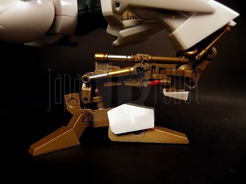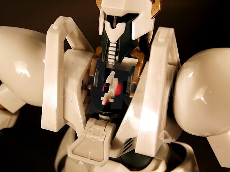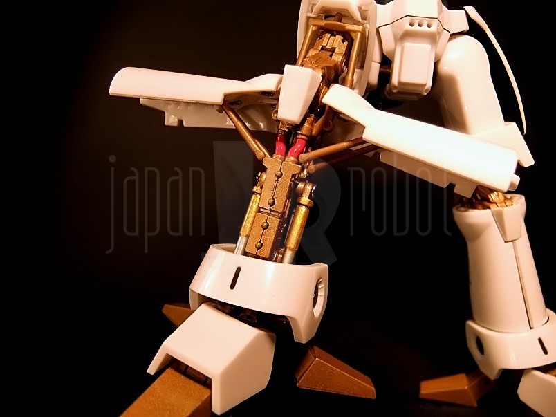 Sorpresa! chi pensa di dover montare i pezzi dell'armatura sul solito corpo metallico si sbaglia! l'L-Gaim giunge a noi completamente assemblato, bell'e pronto per essere esposto!Il corpo in metallo non è brunito ma color oro, gli snodi sono classici -non a scatto- ed in numero superiore visto le particolarità del modello; ovviamente è possibile mettere in evidenza delle parti meccaniche molto ben dettagliate.Dell'L-Gaim saltano subito agli occhi le spalle -per la loro forma a botticella- ed i piedi -per la presenza di due stabilizzatori sul tallone- e subito dopo la banda di gomma morbida scura dell'addome e la testa del robot, per finire con tante piccole particolarità che vedremo man mano.Il colore predominante è il bianco a cui si uniscono il gricio scuro quasi nero dell'addome e dello scudo, e l'oro delle parti meccaniche, delle mani e dei piedi.L'assemblaggio è curato, buona cura dei piccoli dettagli, c'è perfetta uniformità tra il bianco delle plastiche e quello delle -poche- parti in metallo; anche gli accessori -tanti- dedicati al robot sono curati, benché manchi il Display Stand.Il robot viene pilotato da un ragazzo, il posto di pilotaggio non è la classica cabina, ma è richiesto l'aggancio tra L-Gaim e lo 'Spiral Flow', una sorta di moto a reazione; nella scatola vi sono due Spiral Flow, una è destinata ad essere inserita nel collo del robot; per l'inserimento dobbiamo tirare verso l'alto la testa, abbassare lo sportellino anteriore posto propio davanti al collo e spostare indietro la testa : a questo punto è possibile agganciare lo Spiral Flows e ripetere l'operazione in maniera inversa.Si potrebbe pensare che la testa rimanga fissa invece Bandai ha realizzato gli snodi ed i meccanismi d'aggancio in modo tale da permetterne rotazione ed inclinazione.Da notare che la parte frontale e quella posteriore del collo sono state realizzate con dei 'fogli' di gommamorbida scura, ben integrati nell'insieme; gli occhi non ci sono, al loro posto c'è una lastra scura che copre il sensore ottico; il volto -e la testa- dell'L-Gaim ricorda molto quello degli elmi dei guerrire persiani, e questo stile è ripreso in molte parti del robot.La testa è protetta da due grosse staffe che sovrastano e sporgono anteriormente dal torace, ma che non impediscono la visione all'unità visiva del mezzo; il torace è piccolo, ad esso si uniscono due spalle a forma di botticella -o di ovetto, come preferite- dalle quali, nella parte inferiore, partono le braccia; la prima parte è corta e totalmente bianca, mentre la parte finale di ogni braccio è più lunga in quento ospita, nella parte interna, in apposito vano, le impugnature delle spade laser; la parte interna ha anche una leggera escursione che permette di far apparire due puntoni ai lati e sopra ogni pugno.I pungi si inseriscono sul perno attaccato al polso del modello; vi ricordo che troviamo due pugni chiusi, due pugni semi aperti per impugnare le armi, due mani aperte e due mani con le dita estese ed unite; il colore di questi pezzi si avvicina all'oro del metallo del corpo del robot dando un buon contrasto con il bianco dell'armatura; ogni coppia è ben curata nei dettagli, tant'è che più che sembrare mani di metallo, sembrano dei guanti in pelle rinforzati, come quelli da motociclista.Il torace ed il bacino sono mobili grazie allo snodo (o agli snodi) presente/i nell'addome, la posabilità è accentuata dalla fascia di gomma scura che avvolge l'addome -un pezzo rigido l'avrebbe diminuita o appesantito la linea-.Ai lati del bacino troviamo due pezzi d'armatura che proteggono i femori del Robot, mentre posteriormente per protezione v'è collegato uno schudo con la punta sdoppiata;questi tre pezzi sono mobili.La parte anteriore presenta tre fori; a questi si collegano i cavi d'alimentazione dei Power Launher dell'L-Gaim; i cavi sonno scuri, abbastanza rigidi e presentano ad una estremità la spina d'aggancio al robot ed all'altra quella per l'aggancio ai Power Launcher o al Buster Launcher (arma usata dal robot nell'ultima puntata della serie anche se in versione rivista e potenziata MkII) che ricorda tantissimo alcune armi enormi usate in Z-Gundam ed affini.L'L-Gaim ha in dotazione le classiche spade laser ed una spada a doppia lama usata anche come giavellotto; l'impugnatura è alloggiata nella parte interna dell'avambraccio del robot:si gira l'avambraccio verso l'alto, si alza la copertura nera, si estrae l'impugnatura e si abbassa la copertura nell'avambraccio quindi siinserisce l'impugnatura nel pugno e si monta la lama laser gialla; per l'han launcher purtroppo non c'è nessun posto per attaccare la grossa impugnatura pertanto si può simulare l'estrazione di quella piccola e poi recuperare quella doppia nera, inserirla nel pugno e montare le due lame laser gialle.La parte forte dei Gaim sono le gambe : i meccanismi di questi arti sono sviluppati in modo da permettera a questi robot di effettuare balzi giganteschi! L-Gaim è dotato di due ali che si aprono verso l'esterno permettendogli di planare, allungando di molto la distanza percorsa con un balzo oltre ad effetture atterraggi più controllati. All'altezza del ginocchio troviamo i perno, mentre all'interno della parte finale della gamba ci sono i meccanismi per l'apertura verso l'esterno e relativa chiusura del pezzo di corazza bianca che funge da ala; l'apertura è effetuabile anche dalla parte opposta (Randum Slate)!aprire le due parti mette in mostra i meccanismi (pistoni, motori e scheletro metallico) delle parte inferiore della gamba e del ginocchio (particolarissima la scelta dell'articolazione di quest'ultimo avendo le cerniere poste sul retro, un pò come i Pod di Guerre stellari);è possibile, rimovendo le parti dell'armatura, mostrare tutta la meccanica partendo dal ginocchio ed arrivando alla caviglia ed i piede! solo per questa parte del corpo ci sono ben DIECI snodi!!!da notare che Bandai ha inserito anche i tubi rossi di raccordo oltre a tenere alcune parti d