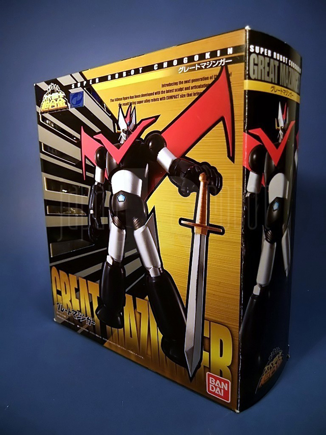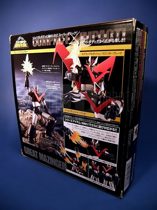 Piccola, ovviamente, date le dimensioni limitate del chogokin. Misura 17 x 19 x 7 cm ed ha un peso altrettanto contenuto. Sull’anteriore è raffigurato il nostro eroe ad ali spiegate che appoggia fieramente la mano sinistra all’elsa della spada piantata nel terreno. Alla sua destra alcune piccole finestrelle di plastica trasparente lasciano intravedere il contenuto. In basso, dietro alla sagoma del robot, è riportato a grosse lettere il suo nome mentre nell’angolo in alto a sinistra campeggia il logo della serie SRC. Sul retro fa mostra di se sulla sinistra una grande e suggestiva immagine del Great Mazinger nell’atto di richiamare dal cielo, con l’indice puntato in alto, il grande fulmine. Sulla sinistra, altri piccoli riquadri mostrano gli accessori in dotazione e quelli aggiuntivi ottenibili con l’acquisto del Mazinger Z della stessa serie.