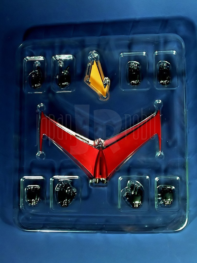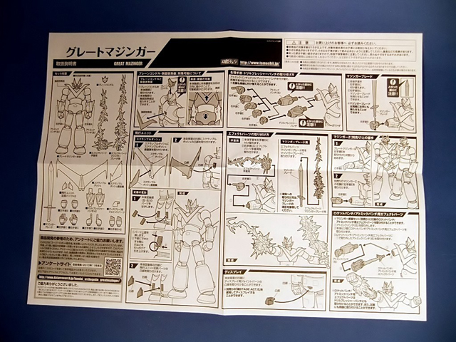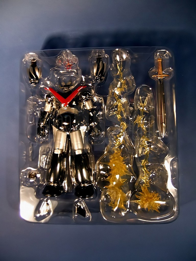 La scatola è interamente occupata da 2 blisters in plastica trasparente impilati uno sull’altro con rinforzo in cartoncino al di sotto di quello inferiore. Il primo blister contiene il toy (con pugni chiusi preapplicati), il brain condor, una spada diabolica, 2 accessori per la riproduzione del thunder break (uno applicabile sul dito indice e l’altro sulla spada per riproporre quelle scene dell’anime in cui il Great Mazinger scagliava il fulmine contro i suoi nemici attraverso quest’ultima), due avambracci alternativi per la simulazione del pugno atomico rotante, i due alettoncini per l’assetto di volo da posizionare sulla superficie posteriore della gamba ed un piccolo perno in plastica applicabile alla faccia posteriore del bacino per consentire l’aggancio ad appositi stand espositivi così da simulare pose di volo. Il secondo blister contiene invece lo scrander, la sua pinna centrale e 4 paia di mani (a dito indice esteso per l’applicazione dell’accessorio simulante il thunder break, a pugno chiuso per l’impugnatura della spada, a dita unite e semiflesse utilizzabile per una friendly pose con il Mazinger Z e a mano aperta). Le istruzioni sono relativamente semplici e riportate su un foglio ripiegato in 4 parti ed alloggiato insieme ad un foglietto promozionale della serie di prossima uscita Mazinkaiser SKL, in una bustina di plastica trasparente.