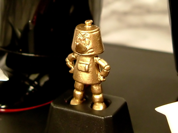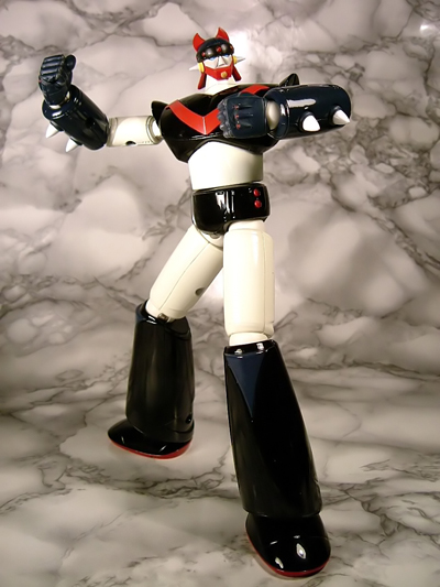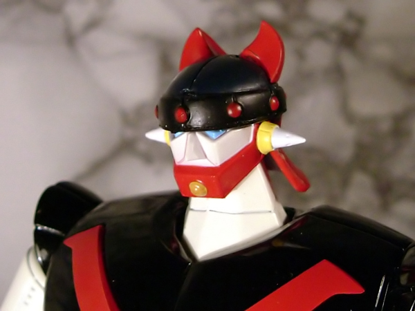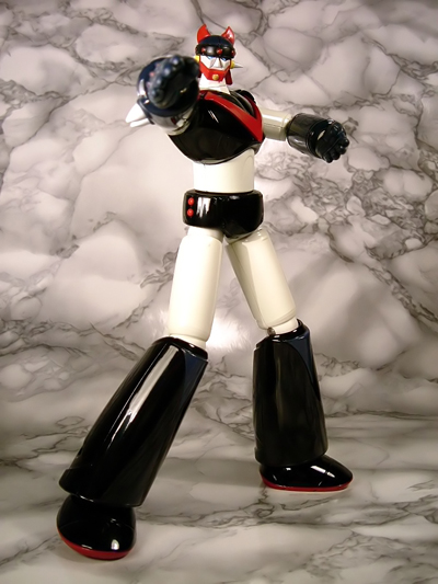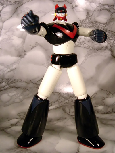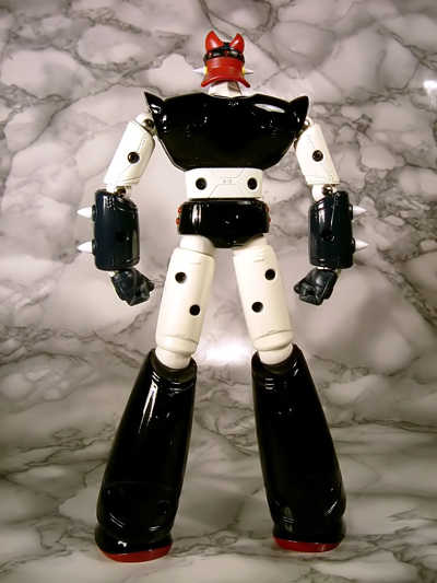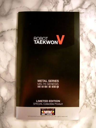 - un blister con base in plastica bianca e coperchio in plastica trasparente conenente una targhetta indicante il numero progressivo del modello (il mio è l'esemplare numero 1305) e il nome del robot con la grossa V di colore cangiante a seconda dell'incidenza della luce, tre paia di mani (uno con dita estese per le pose da karateka, uno con indice puntato e uno con dita piegate ad artiglio) e una figurina in metallo di un personaggio dell'anime da posizionare sulla basetta espositiva.