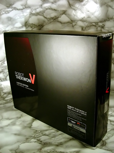 Si parte benissimo, la scatola è di una eleganza stupefacente. Completamente nera e di cartoncino ben più spesso e rigido dei normali soc Bandai, ha dimensioni relativamente contenute (28 x 23 x 6 cm). Sia la faccia anteriore che posteriore sono suddivise praticamente in due metà, la sinistra nero lucida e con suscritto il nome del robot, e la destra nero satinata,con margine delimitante non rettilineo ma con convessità rivolta a destra. Fa quasi tenerezzala storpiatura del termine limited in "limeted" che sotto al nome del robot specifica la tiratura limitata del modello, anche se l'errore è da considerarsi perdonabile (ancora mi ricordo la dicitura purple coler sulla scatola del Mazinkaiser Aoshima e il neologismo poseing sulla scatola dello Shin Getter 2 sempre di Aoshima) e al di sotto di essa la scritta collectible product (prodotto da collezione) conferma la natura selezionata dell'oggetto. La faccia posteriore è esttamente uguale a quella anteriore. Sulle coste il vero tocco di classe è dato dalla presenza di sigilli con suscritto il nome del robot a chiudere la scatola (2 per lato) al posto del normale scotch cui siamo solitamente abituati. Quasi dispiace doverli staccare nel momento in cui si apre la scatola, ma se vogliamo proseguire la recensione non abbiamo scelta............ In tutto ciò risalta la senazione di spaventosa pesantezza della confezione nel momento in cui la si soppesa tanto da avermi fatto sospettare che nella scatola arrivatami dalla Corea fosse alloggiato un mattone invece del modello.