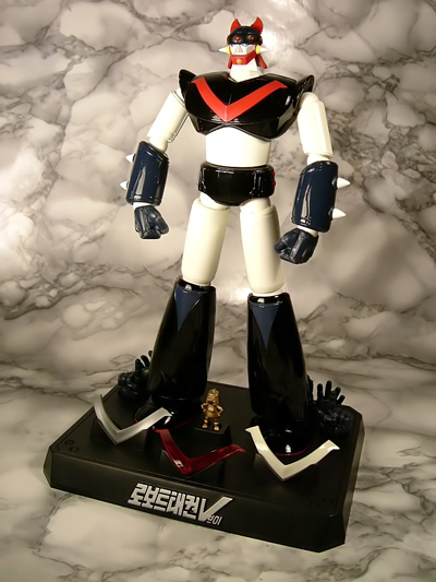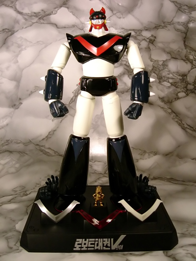 Ed ecco che con il 2009 il mitico archivio recensioni di Japanrobot si arricchisce del primo resoconto relativo a un modello nato e prodotto in Corea. Il Taekwon V non solo è infatti noto per essere il clone coreano tarocco del Grande Mazinga di cui ricorda ampiamente colori e forme, ma nell'anno corrente è stato riprodotto dalla casa coreana NeoStorm sia in versione action figure in pvc che in quello che sarà l'oggetto della nostra recensione, e cioè un modello diecast originalmente prodotto nella tiratura limitata di 1976 esemplari (numero corrispondente all'anno in cui l'anime veniva edito in Corea) che, come vedremo, stupisce per essere la prima produzione in metallo di questa casa, sia per la qualità delle finiture che per la quantità di metallo impiegata potendo tranquillamente competere con case di produzione giapponesi ben più note e blasonate. Una piacevolissima sorpresa dunque, i dettagli della quale andremo a scoprire nelle prossime righe se mi onorerete della vostra attenzione....