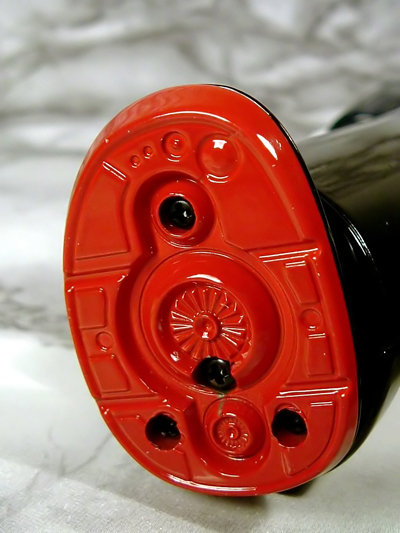- un secondo blister con base bianca e coperchio trasparente contenente la basetta espositiva realizzata in pieno stile soc con tanto di nome del robot inciso su di essa e tre piastre pettorali intercambiabili di diversi colori (bianco, grigio argentato e rosso traslucido). Sia in questo blister che nel precedente il coperchio non è assicurato alla base con scotch come solitamente avviene per i gokin che meglio conosciamo.