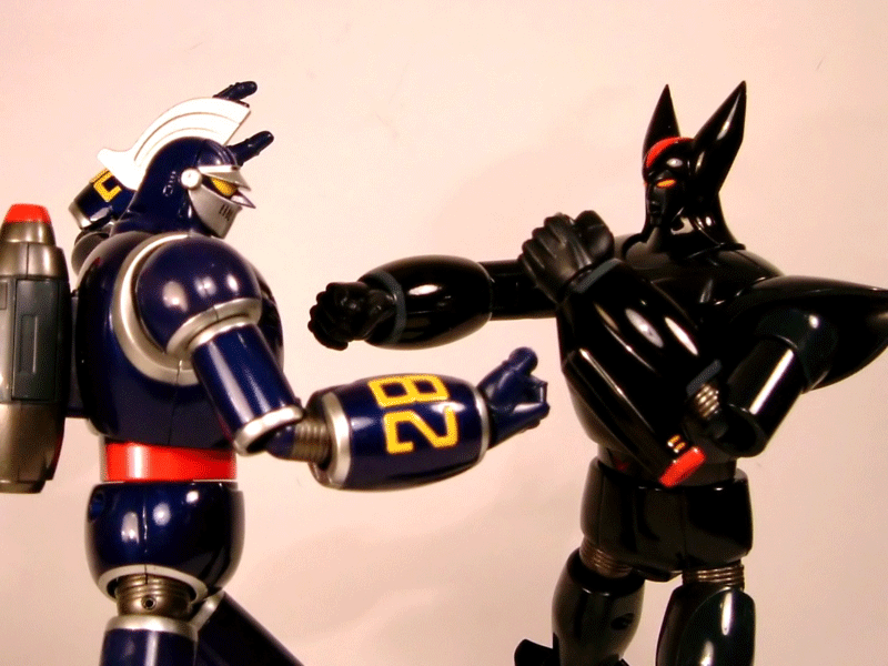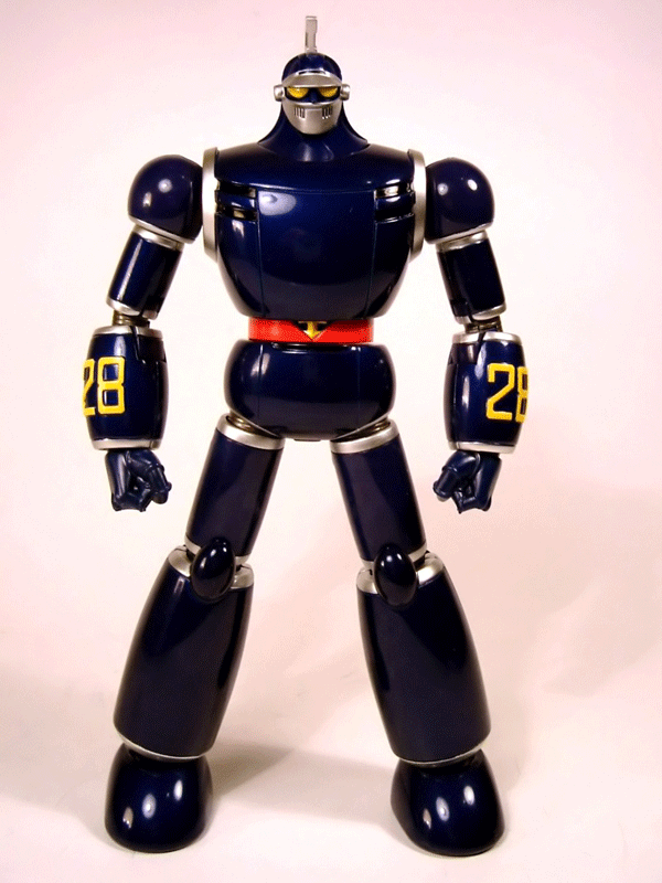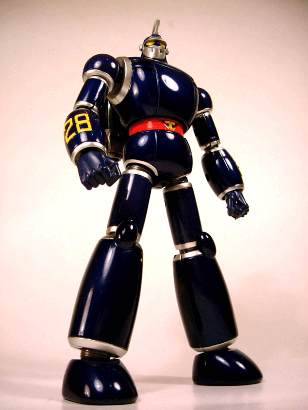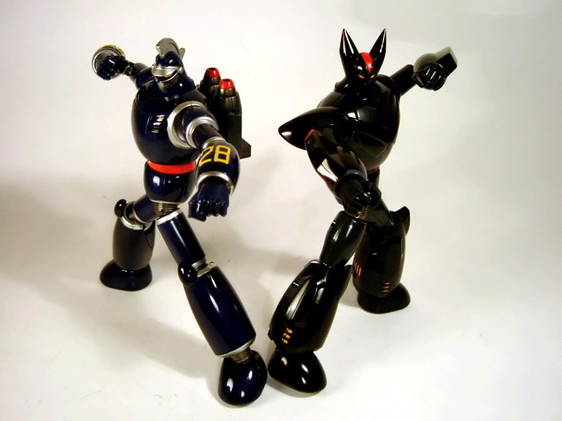 Il peso della scatola prometteva bene, quello dei modelli ovviamente non delude. Il T28 pesa ben 465 grammi per un'altezza di 18 cm ed è quasi interamente in metallo dal momento che le sole parti in plastica sono le cosce, gli sportellini sulla parte posteriore delle gambe, la cintura rossa, la testa e le spalle. La verniciatura è ottima e colpisce molto il bellissimo tono di blu scuro metallizzato che è stato usato. Dispiace non poco dover constatare la discrepanza di colore, apprezzabile ad una osservazione attenta e messa impietosamente in risalto da più di una delle foto con flash fatte al robot e reperibili in rete, tra le parti plastiche più opache e quelle metalliche, dotate di una maggior lucentezza. Anche le mani, in pvc, hanno un colore che si discosta un po' troppo da quello della livrea del robot. Probabilmente se fossero state fatte in plastica come per alcuni soc tale differenza si sarebbe notata meno. Ad ogni modo la vernice è ben distribuita e le imperfezioni presenti sono modeste, in linea con la tradizione Bandai. Davvero particolari i numeri 28 gialli stampati in rilievo sugli avambracci. I reattori, in plastica, sono applicabili sulla schiena con aggancio calamitato. Carino il sistema a molla per cui una volta applicati sulla schiena del robot, se ne possono far fuoriuscire lateralmente le ali con una semplice pressione sul corpo centrale. Passiamo adesso al capitolo posabilità. Partiamo col dire che in questo modello, nonostante la sua apparente semplicità, Bandai ha concentrato una serie di soluzioni tecniche che in parte ho apprezzato e in parte meno.Bellissimo il modo in cui sono state concepite le articolazioni delle caviglie che possono essere estratte così da permettere movimenti più ampi. Apprezzabili anche le articolazioni a scatto delle ginocchia che presentano escursioni estreme tali da consentire al robot di mettersi addirittura in ginocchio grazie alla presenza di sportellini a molla nella zona postero-superiore della gamba in cui la parte posteriore della coscia si va ad alloggiare nelle flessioni più spinte. Molto discutibile,invece, il sitema ad estrazione ideato per l'articolazione dell'anca, non a caso più di una persona si è lamentata per la scarsa capacità del modello di divaricare le gambe date le modeste escursioni laterali. Precisiamo che per dare maggior mobilità alle anche è necessario effettuare l'estrazione dello snodo, cosa che è praticabile con un sistema a due scatti, con il primo di questi, semplice da effettuare, si abbassano leggermente e in contemporanea le cosce e la parte inferiore del bacino,interposta tra il blocco anteriore e quello posteriore di quest'ultimo, con il secondo scatto in cui è necessario tirare molto forte (non temete, non si rompe nulla, tirate senza timore) si abbassa ulteriormente la coscia liberando lo snodo di circa mezzo centimetro così da garantirgli maggior libertà di movimento. Sia chiaro che nonostante l'estrazione dello snodo l'articolazione non guadagna assolutamente niente in lateralità ma guadagna moltissimo nei movimenti di estensione e flessione della coscia. Grazie alla concomitante capacità di rotazione di coscia e gamba si riesce così a dare al modello pose discretamente dinamiche anche se a mio avviso l'effetto visivo dell'articolazione dell'anca in corrispondenza della coscia estesa resta esteticamente molto discutibile. Il busto ruota rispetto al bacino con un sistema ad attrito in corrispondenza della cintura rossa. Le spalle,i cui movimenti di rotazione (a 360°) sono regolati da un sistema a scatto hanno totale libertà di movimento. I gomiti presentano un innovativo sistema tale da consentire flessioni estreme,praticamente a 180°. Purtroppo la notevole funzionalità di questa soluzione si scontra con una discutibilissima estetica per cui nelle flessioni più estreme la spontanea fuoriuscita di un piccolo segmento che unisce l'avambraccio al braccio si fa notare per bruttezza. Bello invece il sistema con perno a sfera con cui è stato concepito l'attacco della testa dal momento che data la caratteristica conformazione del robot questo non ha un collo ben definito. In questo modo è possibile l'uso di una testa intercambiabile con la possibilità di estendersi così da simulare le pose di volo del robot anche se a dirla proprio tutta, sarebbe stato allora giusto mettere in dotazione nella confezione uno stand apposito per questo tipo di pose. Passiamo a questo punto al Black Ox. Meno ricco in metallo rispetto al T28, anche il nerone si difende quanto a peso facendo spostare la lancetta della bilancia