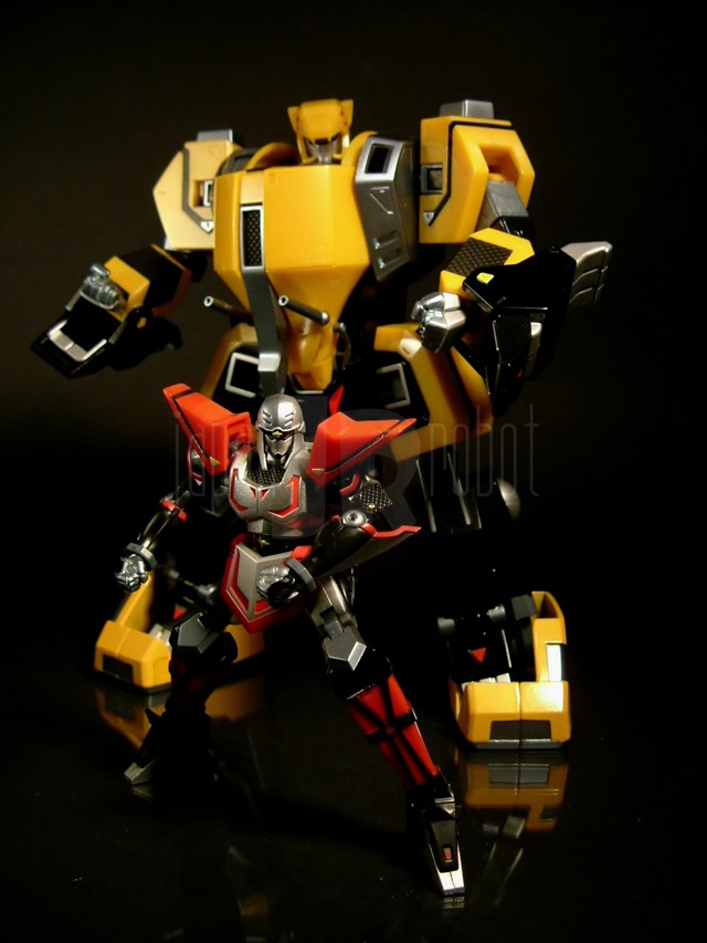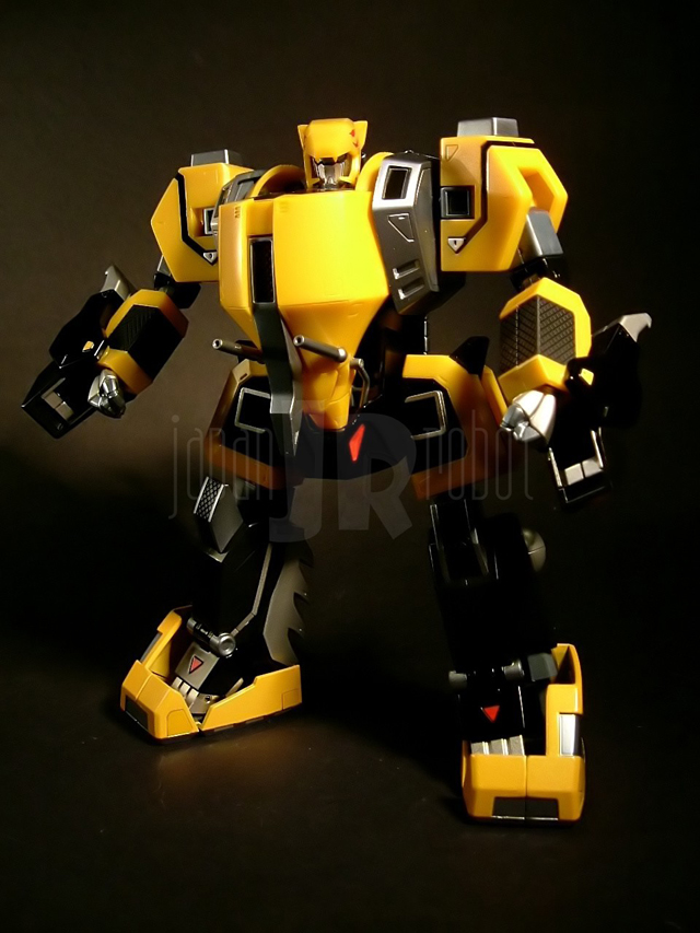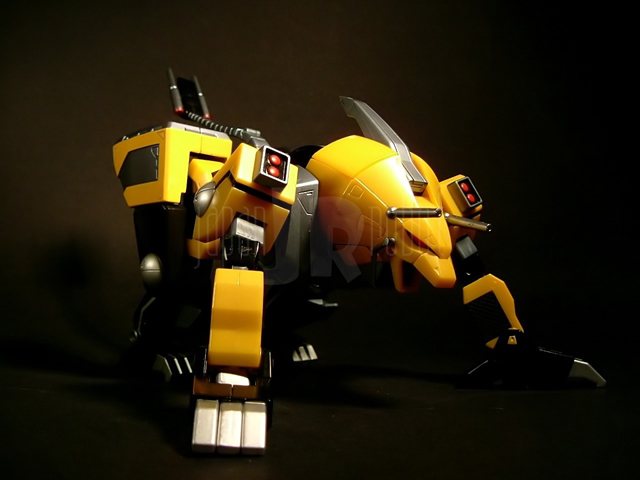 Si estrae il Kurojishi dal tanto vituperato blisterino e per gli amanti della zama la musica cambia, in modo radicale. La sensazione di pesantezza trasmessa al nostro leoncino è relativamente soddisfacente, 414 grammi per 17 cm scarsi di altezza non sono pochi. Sono in metallo i piedi (sia la parte gialla che quella nera), gran parte del tronco (la parte nera più precisamente, bacino e tutto il dorso tanto per intenderci) e gli inserti neri sugli avambracci che vanno a formare le zampe anteriori del leone. Il resto è in plastica. Basta applicare sulla schiena la coda ed il nostro Black Lion è completo. Capitolo verniciatura: non presenta particolari imperfezioni e si conferma perciò in linea con la tradizione Bandai, ma ancora una volta non posso esimermi dal constatare come la diversa tonalità del giallo nelle parti composte da materaili diversi (piedi vs resto del corpo) stoni seppur in modo meno sensibile di quanto osservato in passato. In generale il giallo risulta in più di una parte un po' troppo piatto (complice la verniciatura in pasta), ed è un vero peccato dal momento che con una cura maggiore e l'accortezza di usare qualche linea di pannellatura in più in alcune sedi come la criniera del leone, le spalle o le anche, il risultato finale sarebbe stato decisamente diverso. Piccola curiosità: le appendici sui lati delle anche, nere sul modello, appaiono per motivi a me ignoti di colore giallo nelle foto presenti sulla scatola. La posabilità non è certo quella del Tobikage essendo peraltro condizionata dalla necessità di conversione a leone, ma nel complesso risulta soddisfacente. Le caviglie hanno una buona inclinazione consentita dall'estrazione della parte gialla dal resto del piede dal quale è parzialmente svincolata. Le ginocchia sono a scatto e si flettono a poco meno di 90 gradi. La coscia ruota liberamente rispetto all'anca e quest'ultima, complici i limiti imposti dalla trasformabilità, non ha escursioni laterali ma solo la possibilità di flettersi anteriormente ed estendersi posteriormente (movimenti governati da una articolazione ad attrito peraltro rigidissima). La spalla è flessibile anteriormente come articolazione ad attrito funzionando invece a scatto in rotazione. Il braccio, all'aggancio con la spalla, è abducibile a 90 e rotabile a 360 gradi. Il gomito, ad attrito, oltre a flettersi ad angolo retto, ruota liberamente svincolando parzialmente i movimenti dell'avambraccio da quelli del braccio. I polsi hanno una flessione discreta e l'applicazione delle mani è agevole anche se si fa una certa fatica a far impugnare con le apposite mani il cannone. La testa ha modesti movimenti di flessione mentre la rotazione è totale, risulta forse un po' troppo incassata nelle spalle e posizionata posteriormente. La trasformazione è meno semplice di ciò che si potrebbe pensare, almeno in parte nel senso che se gli arti superiori del robot sono agevolmente convertibili nelle zampe anteriori del leone, ben più complessa è la metamorfosi delle gambe nelle zampe posteriori. Abbastanza elementare invece "appallottolare" il Tobikage così da permettergli di incastonarsi nel petto del mecha leonino. A conversione effettuata il risultato estetico finale è decisamente buono, anche se condito da più di un ma. Prima di tutto mi corre l'obbligo di sottolineare come nei modelli a 4 zampe, in termini di posabilità Bandai non abbia fatto in questi ultimi anni particolari passi in avanti essendo il grado di mobilità di questo Kurojishi praticamente sovrapponibile a quello dei mecha (Land Cougar e Land Liger) che formano i piedi del gx-13 Dancouga. Scarsa o meglio, nulla, purtroppo, anche la mobilità della testa. Ok che la trasformabilità impone dei limiti ma di fatto la testa risulta bloccata e lo sguardo del leone costantemente rivolto in basso in posizione di carica. La bocca è apribile e anche qui ho trovato un difettucolo (questa volta ammetto di essere decisamente pignolo...): i denti sono piccoli e non verniciati, quasi inapprezzabili, e la nostra povera belva appare ad una prima superficiale occhiata tristemente sdentata. Pochi (perchè tali risultano anche nella serie) gli accessori: carina l'idea delle bocche di fuoco ruotabili del cannone del Kurojishi, qualche segno di distacco dalle sprue di troppo sulle armi del tobikage, intelligente l'uso del grigio invece che del cromato sulle lame dato il tipo di verniciatura del ninja. Stona un po' l'assenza di una basetta espositiva che, seppur personalmente trovo inutile, avrebbe viceversa fatto molto piacere ad altri appassionati.