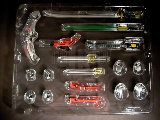 - Due blister di plastica trasparente impilati l'uno sull'altro nel primo dei quali troviamo il Tobikage, il Kurojishi (entrambi con mani chiuse a pugno preapplicate) e la mitragliatrice di quest'ultimo. Il secondo blister da invece alloggiamento alle mani di ricambio (due paia per entrambi, uno con dita estese ed uno chiuse a pugno per l'impugnatura delle spade), due spade a testa (una laser e una più lunga con lama per il Kurojishi, una normale e una con doppia lama per il Tobikage), il fucile e la balestra del Tobikage, la coda del Black Lion, due foderi per la spada a singola lama del Tobikage (uno applicabile alla schiena, uno utilizzabile come "baionetta").