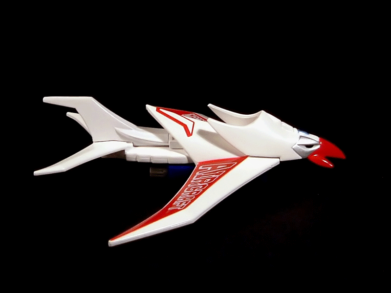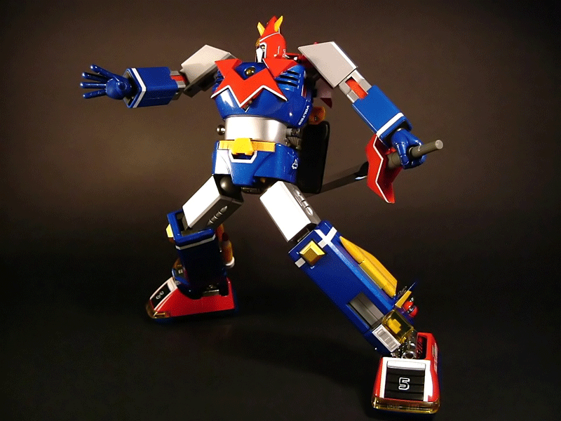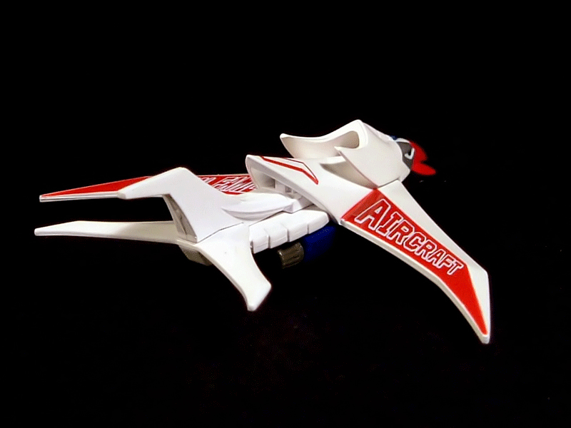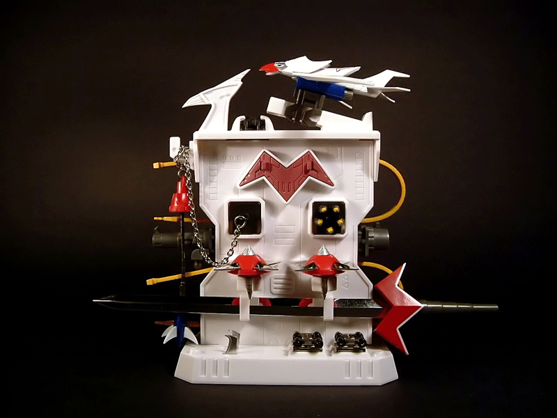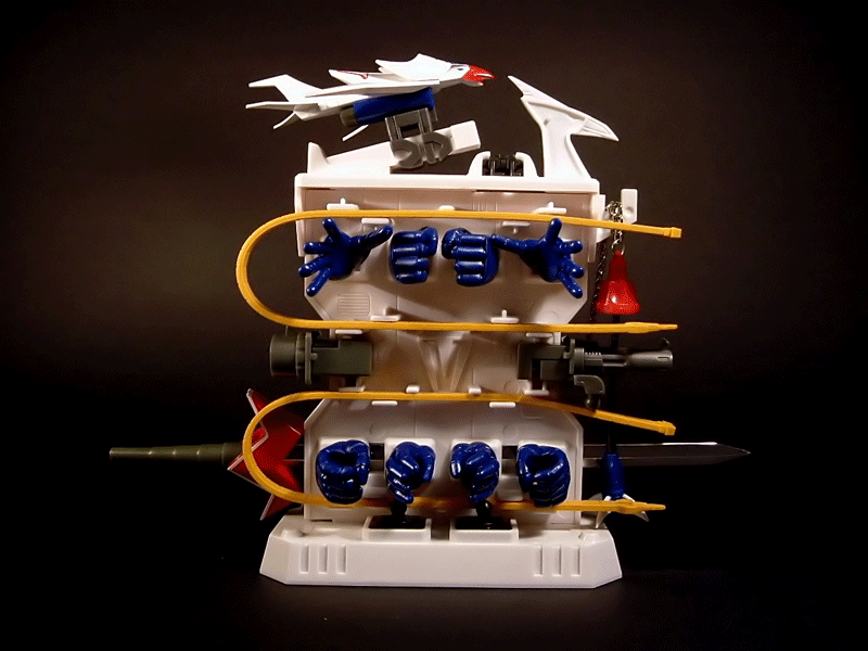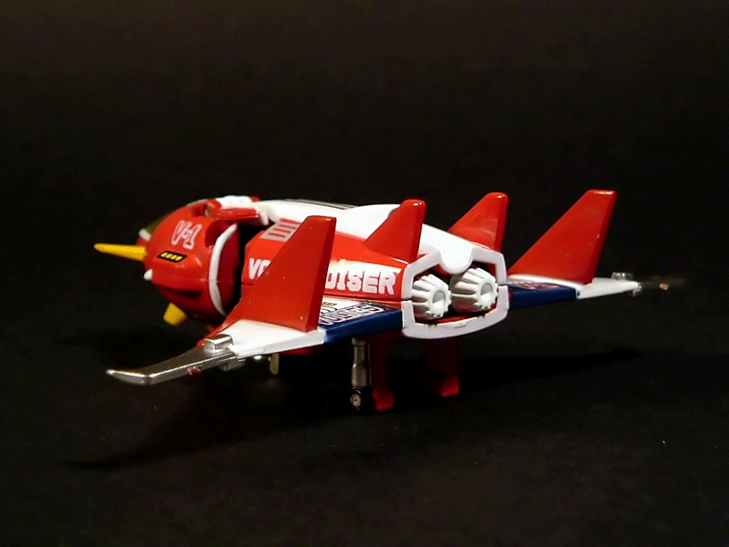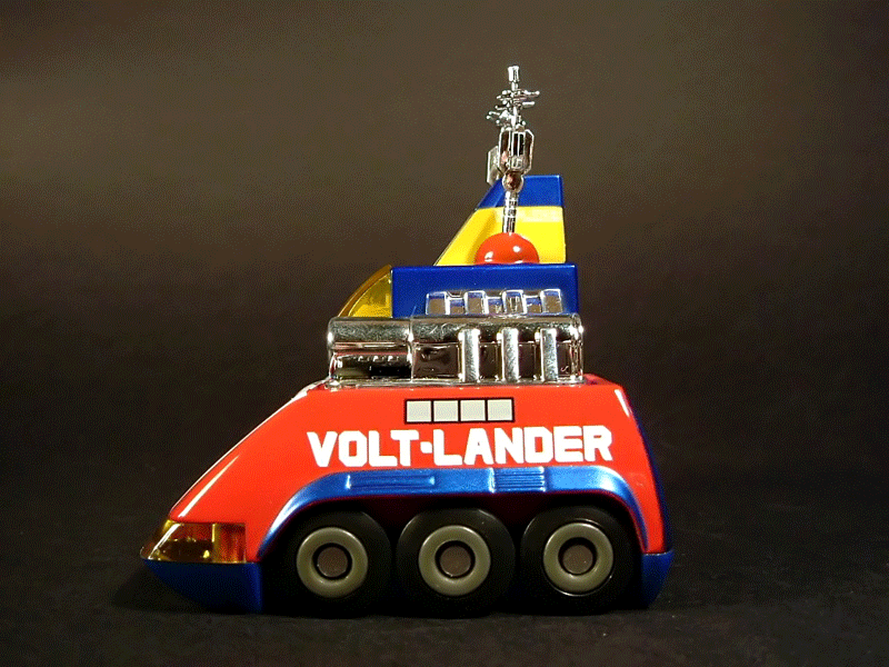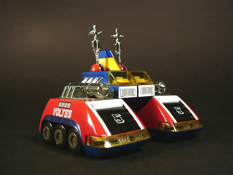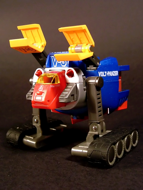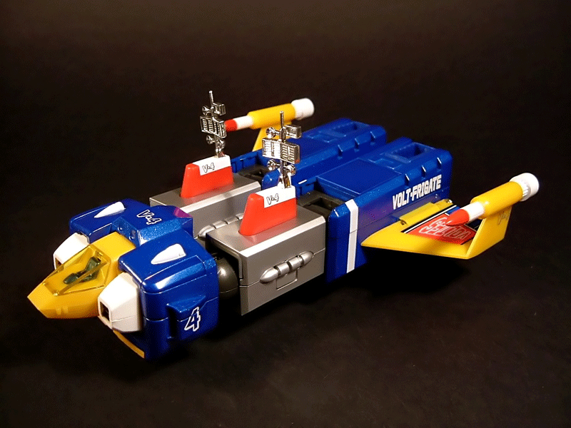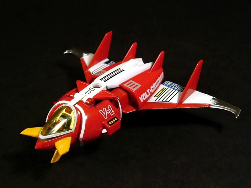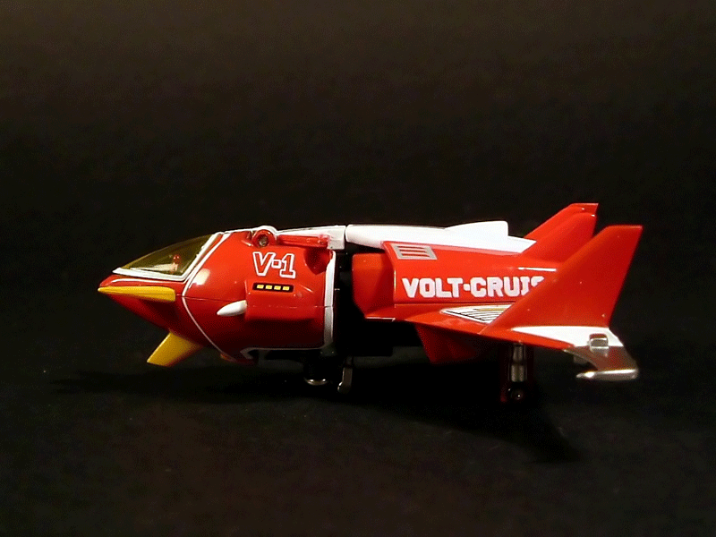 - grosso contenitore in polistirolo con mascherina in cartoncino che fa molto vintage in cui troviamo adagiati nei rispettivi alloggiamenti e protetti dal contatto con il polistirolo dalle abituali bustine di plastica trasparente: i 5 mezzi (Volt Cruiser, Volt Bomber, Volt Panzer, Volt Frigate e Volt Lander), lo sparviero meccanico, due roller plate, un supporto per permettere l'aggancio del componente aggiuntivo allo sparviero meccanico, la piastra da applicare sul petto con relativa spada ripiegabile ed una seconda piastra per simulare l'estrazione della spada dal petto quando si espone il robot facendogliela impugnare.