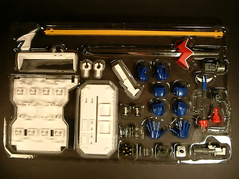 - grande blister in plastica dove trovano alloggiamento: 4 paia di mani (aperte, chiuse a pugno, semichiuse e chiuse con foro centrale per l'impugnatura della spada), lo stand espositivo suddiviso in 7 componenti separate, due paia di carrelli rispettivamente con 4 e 2 ruote (per il Volt Bomber), la grande spada (Tenkuken), il componente aggiuntivo che nell'anime lo sparviero meccanico deposita nella schiena del Voltes, un paio di corde megaelettronucleari, la catena spaziale, un sistema sparante per simulare il lancio della catena, il bazooka (a differenza del gx-31 in questo caso non è estraibile dall'avambraccio ma lo si deve applicare come parte opzionale), un paio di placche con relativi perni per l'aggancio delle mani da applicare agli avambracci e una placca che simula le bocche di fuoco della torpedine solare sempre applicabile agli avambracci.