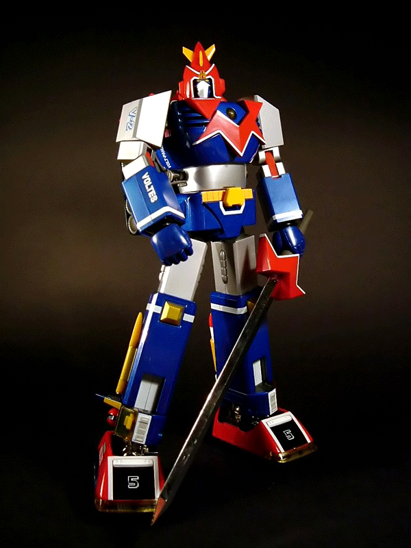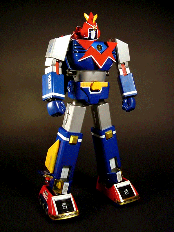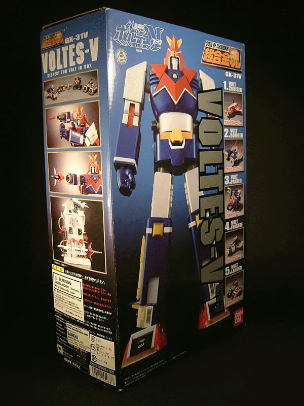 Nel 2008, a distanza di 2 anni dall'uscita del gx-31 Voltes V, Bandai torna a riproporre in versione alternativa lo stesso soggetto. Non si tratta in questo caso, come già avvenuto in passato, di una semplice ristampa o di un mero recolor, ma di un modello che si differenzia non solo cromaticamente ma anche strutturalmente rispetto al soc della serie regolare. La sigla scelta per questo nuovo Voltes è gx-31v dove la lettera v sta per Volt In Box. Il nome per esteso del modello è infatti: Voltes V Respect for Volt in Box. La traduzione italiana suona grossomodo come Vultus V, omaggio al Volt in Box. Questo modello è infatti stato proposto come omaggio al Voltes Volt in Box (famosa versione vintage dello stesso robot prodotta da Popy nel 1977) e ne riproduce non solo il tipo di verniciatura, ma anche il particolare ed originale packaging. Come detto questo gx-31v non è quindi un semplice recolor del ben noto gx-31, ma si differenzia da quest'ultimo anche dal punto di vista tecnico come dimostra la sua maggior stabilità a livello di anche e (soprattutto) caviglie, arcinoto punto debole del peraltro ottimo soc regolare. Questa ed altre innovazioni che non vi voglio anticipare per costringervi a leggere tutta la recensione (oggi mi sento cattivello, eh eh...) giustificano una nuova recensione da aggiungere al già eccellente lavoro fatto da Michele per il gx-31 rispetto al quale cercherò quindi di concentrarmi solo sulle differenze che distinguono i due modelli. A questo punto siamo pronti per partire.....