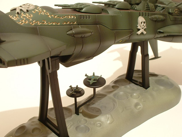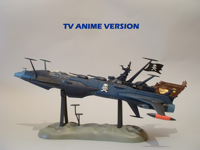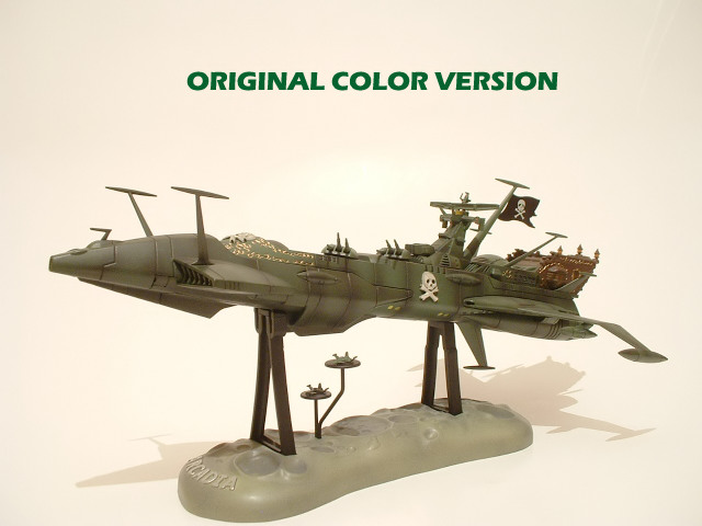 Ovviamente le versioni disponibili sono diverse, quattro per l’esattezza, TV Anime Version con i colori classici del cartone animato, Original Color Version – colorazione verde invecchiata come nel fumetto, Anime Export Version – colorazione classica ma invecchiata e per finire la Black Version – totalmente nera e con un extra item all’interno, il caccia di Harlock lungo ben 8 centimetri con tanto di piedistallo per l’esposizione!!! Le tre Edizioni Aoshima, Tv, Original e Black sono colorate molto bene, stupenda la versione verde invecchiata, mentre qualche imprecisione si è riscontrata sulla Anime Export, cosa che sembra accompagnare purtroppo ogni loro produzione. Diciamo subito che l’acquisto obbligato è quella della versione TV con i colori classici, io ho comprato anche la Original Color Version perché da piccolo avevo il modellino della Polystill proprio in quella colorazione……quanti ricordi………quindi per me acquisto di carattere nostalgico. La Black ha ragione di essere comprata solo se nella collezione è presente la versione nera della precedete Arcadia, mica si potrà lasciarla sola no?! L’edizione Anime Export risulta essere però più fedele ancora della TV Anime, i colori sono stati resi leggermente più scuri dando secondo me quel tocco di veridicità in più rispetto alla versione normale dove le differenze di tonalità tra blu scuro e chiaro sono più evidenti. Se si guarda attentamente la serie animata si nota molto bene che la colorazione dell’Arcadia è praticamente tutta blu scuro, fatta eccezione per la punta della nave che è di color azzurro chiaro. La ditta Anime Export ha poi aggiunto anche una leggera invecchiatura alla colorazione, particolare che purtroppo non si nota molto dato che il colore del modello è già di per se molto scuro.