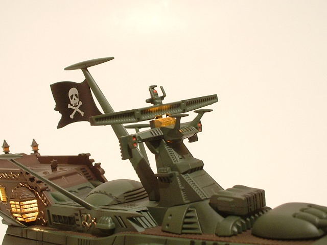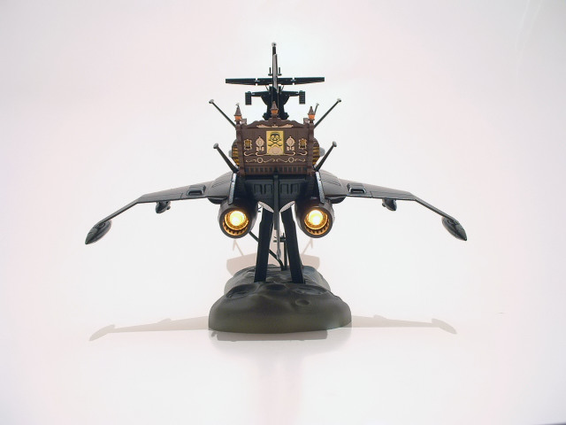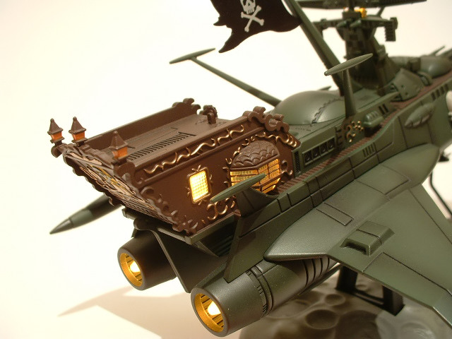L’astronave è molto ben costruita, si ha una bella sensazione di solidità nel maneggiarla, gli unici punti critici sono le due antenne di prua, sono molto sottili e si potrebbe incorrere in una facile rottura, quindi è consigliabile toccare con cura questa parte del modellino. Molto belli i fregi dorati che adornano l’Arcadia, soprattutto quelli nella parte avanzata della nave, appena prima dei cannoni. Sopra il teschio simbolo dei pirati, ne troviamo due anche sui lati centrali della Death Shadow oltre a quello che campeggia sulla Bandiera. Le torrette dei cannoni ruotano e si alzano come per la precedente realizzazione, mentre la forma della torre di comando è molto più semplice e priva dei radar laterali. Leggermente diversa la Cabina del Capitano a poppa, niente bandiera nella parte superiore, tre i lampioncini di contorno e solo due finestre laterali in sporgenza. Nella parte sottostante della nave troviamo lo sportello per la fuoriuscita dei caccia, qui sistemato nella parte centrale e molto più grande rispetto al precedente, l’alloggiamento per le batterie che permettono l’illuminazione di alcune parti interne e nella parte posteriore il tasto per l’accensione. Le parti che s’illuminano sono quattro, la parte superiore della torre di comando, il cupolino posteriore insieme alla cabina di Harlock e naturalmente i motori, questi molto più grandi rispetto all’Arcadia precedente.