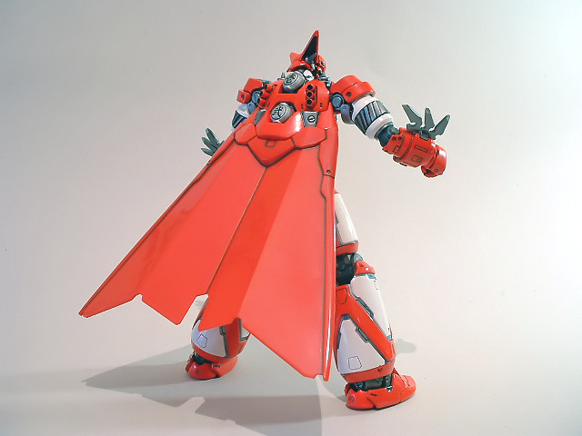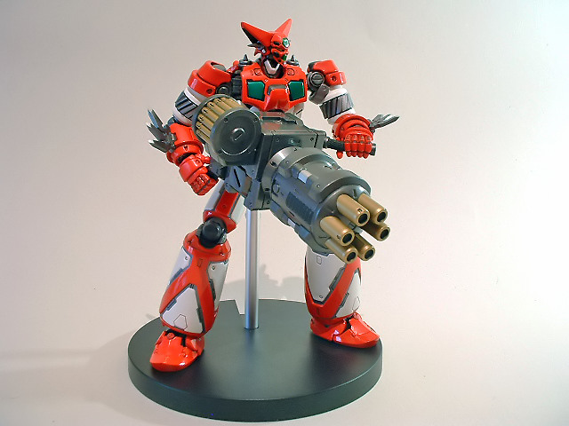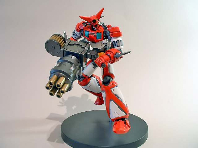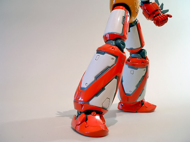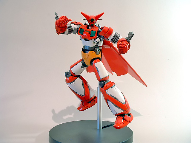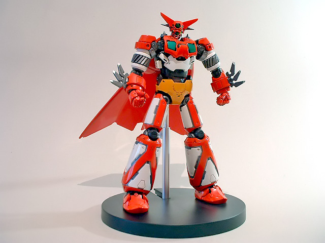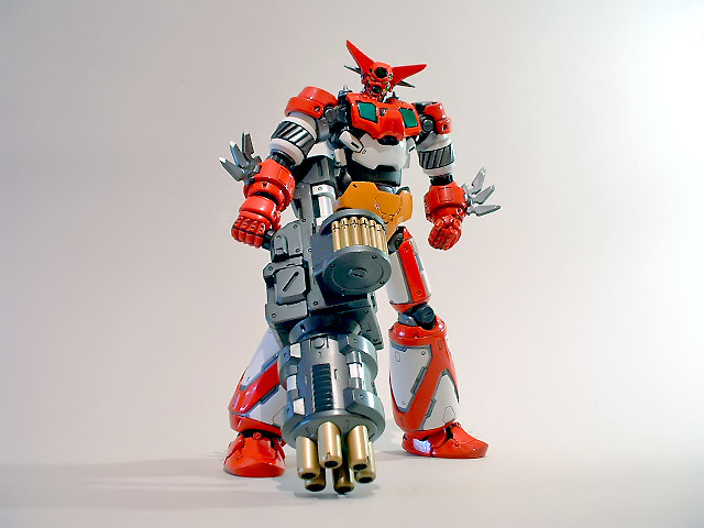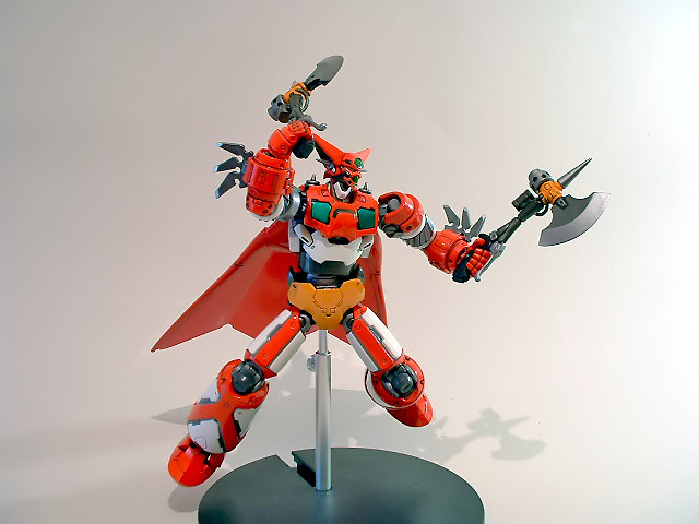 Il Getter 1 è, come per la versione Black, molto pesante e massiccio, composto quasi totalmente in metallo ad esclusione di alcune parti come la testa, le mani, le spalle, il mantello e le due asce, gioia per i puristi della sacra zama ^___^ e non. La verniciatura è abbastanza curata, sulla mia copia ho rilevato solo due piccole imprecisioni nel retro delle gambe, le plastiche si mescolano cromaticamente molto bene con tutto il resto della verniciatura su metallo. L’effetto visivo generale è di assoluta linearità su tutto il modello…..change Gettaaaaa ooone!!!………..La posabilità è ovviamente identica al predecessore, le caviglie s’inclinano, le gambe godono di una buonissima apertura e rotazione, dal ginocchio in giù è possibile ruotare l’arto. Anche per le braccia c’è molta libertà di movimento, rotazione a 360 gradi totale, anche per i soli avambracci, possibilità di avanzamento avanti e indietro delle spalle, anche se limitate un pochino dalla piastra pettorale, mani posizionabili e leggermente diverse da quelle viste nel Getter Black. Sono un tantino più robuste e permettono una presa molto più salda dei due Tomahawk e del gigantesco Machine Gun!!! La stabilità è buona anche con il mantello applicato, se vi ricordate bene questo era un difetto della versione Black, il Getter tendeva a sbilanciarsi all’indietro a causa del notevole peso dell’accessorio. Fewture ha risolto questo problema alleggerendo molto il mantello del Getter 1 rendendolo molto sottile e schematico nella forma, personalmente lo trovo molto brutto.