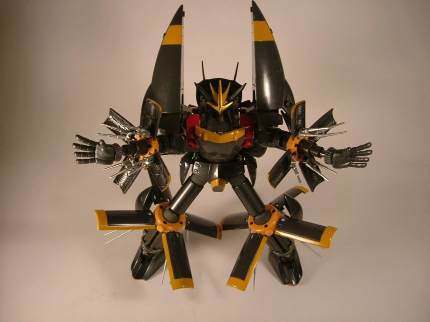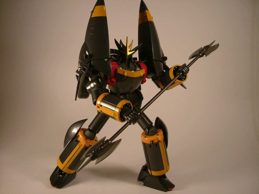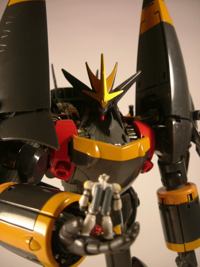 La posabilità del modello ha dell'incredibile, complice la notevole mobilità sia in senso laterale che antero-posteriore dell'articolazione dei femori sul bacino e la presenza di una articolazione a scatto tra quest'ultimo e il torace tale da permettere movimenti di torsione del tronco. Le ginocchia si flettono notevolmente e anche le caviglie sono libere di piegarsi abbondantemente. Personalmente ho preferito esporre il mio modello con i piedi trasformabili in quanto ho dovuto constatare una certa "mollezza" (comunque niente di eclatante) delle caviglie usando i piedi intercambiabili sostituibili a quelli trasformabili. Di fatto il problema non si è presentato per altre persone che hanno acquistato il modello. Anche il movimento delle braccia è liberissimo, soprattutto perchè le grosse spalle hanno uno snodo indipendente da quello presente tra torace e braccia così da non vincolare il movimento degli arti superiori. La mobilità della testa è discreta. Un difetto riconosciuto rispetto alla controparte animata è sicuramente l'eccessiva snellezza dei femori rispetto alla gamba, il Gunbuster dell'anime ha infatti una coscia ben più massiccia, ma ovviamente l'obbligo di riprodurre la trasformazione del modello ha reso necessario questo compromesso. Come detto la colorazione è molto buona, con i soliti piccoli difetti della grande produzione Bandai e soprattutto la trasformazione è concepita in modo tale da non provocare graffi sulla vernice. Le grandi spalle hanno nella loro parte interna sportellini che danno adito ad alloggiamenti rispettivamente per: a destra il grande mantello, a sinistra l'ascia e la mazza (anch' essa accorciabile per la sistemazione nel relativo scompartimento con un dispositivo a cannocchiale), armi che peraltro il GunBuster non usa nell'anime (ma che probabilmente erano state concepite nei primi disegni dello studio Gainax). Di grande impatto visivo la posa con gli sportelli dei buster colliders aperti.