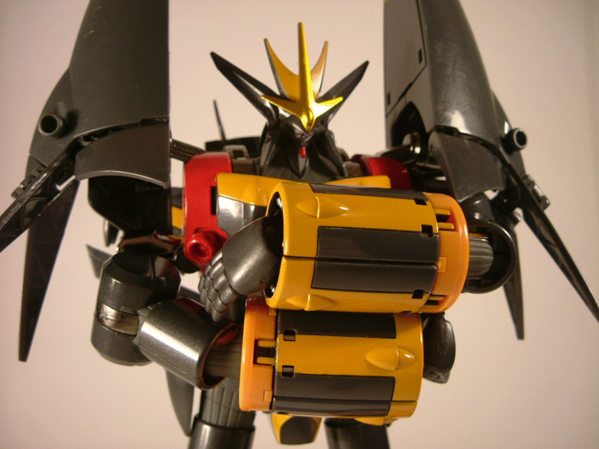 La trasformazione delle 2 Buster Machines in GunBuster non si può certo dire che sia semplice, Bandai ha concentrato in questo modello una serie di soluzioni tecniche che hanno dell'incredibile, non penso di sbagliare se affermo che il GunBuster è certamente il modello tecnicamente più complesso e sofisticato sinora prodotto da Bandai per la linea S.O.C. La sola trasformazione dei piedi ha dello stupefacente, non so quante volte l'ho ripetuta, estasiato dalla perizia tecnica con cui è stata concepita. La prima volta che ho trasformato il modello ho avuto difficoltà in un paio di passaggi, complice l'assenza di qualche illustrazione in più sul libretto d'istruzioni che avrebbe fatto sicuramente un gran comodo. In certi momenti si ha il timore di rischiare di spaccare tutto, ma niente paura, come tutti i S.O.C. anche il GunBuster è assai resistente. Ad ogni modo una volta eseguita la trasformazione la si può poi realizzare nuovamente con facilità nel giro di pochi minuti senza alcun problema di sorta. Peraltro il sistema a cannocchiale per l'estrazione delle cosce dalle gambe, pur essendo analogo a quello del gx-27, non riconosce gli arcinoti limiti di instabilità di quest'ultimo essendo stato in questo caso ottimizzato grazie all'adozione di due fermi per coscia che bloccano lo scorrimento della gamba a fine corsa.
