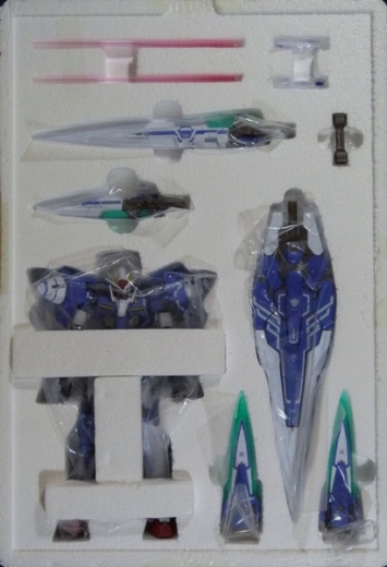 Lungo e largo come la confezione, l’alloggiamento in polistirolo contiene i componenti principali (Gundam e spade), tutti avvolti nei rispettivi sacchetti si plastica. Per la precisione: