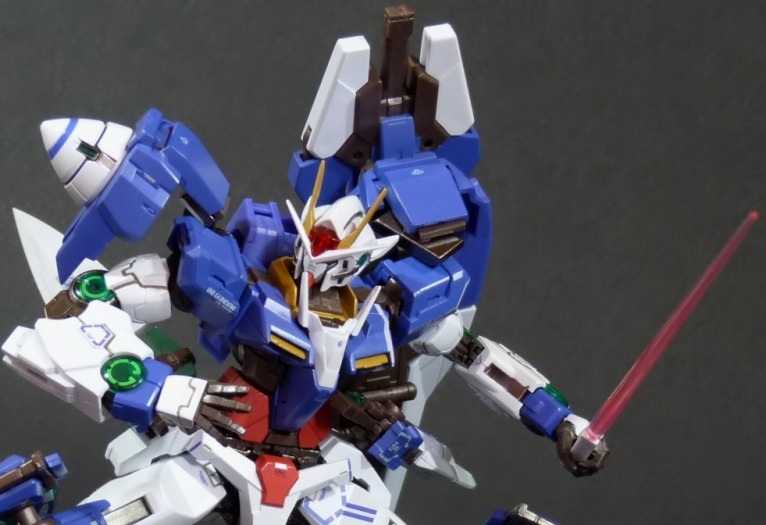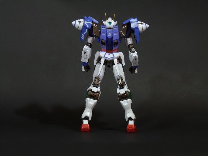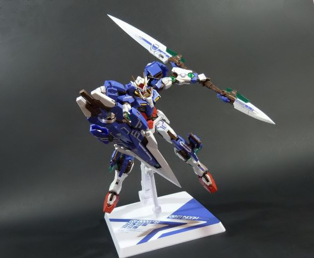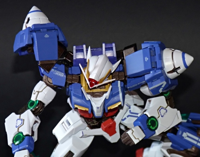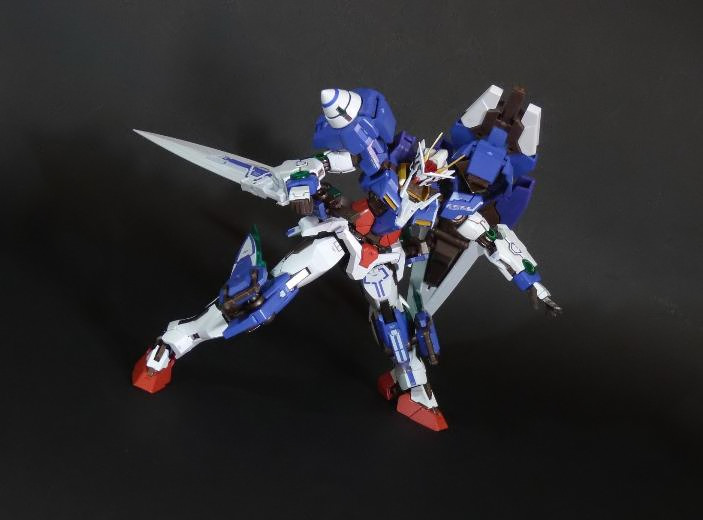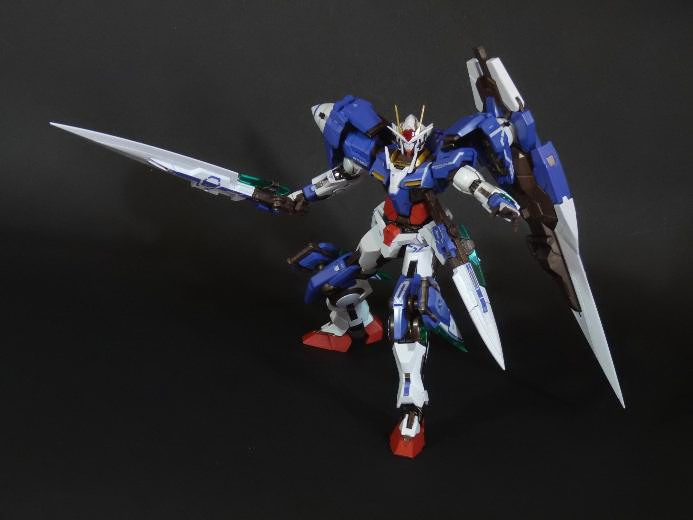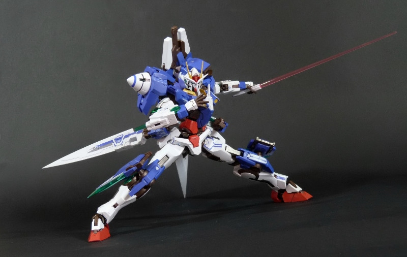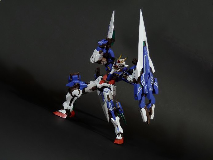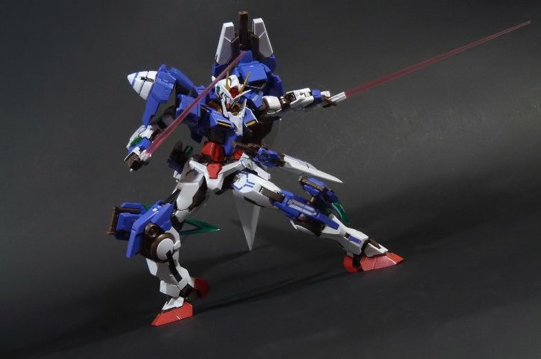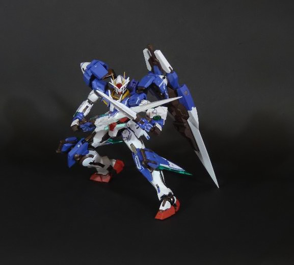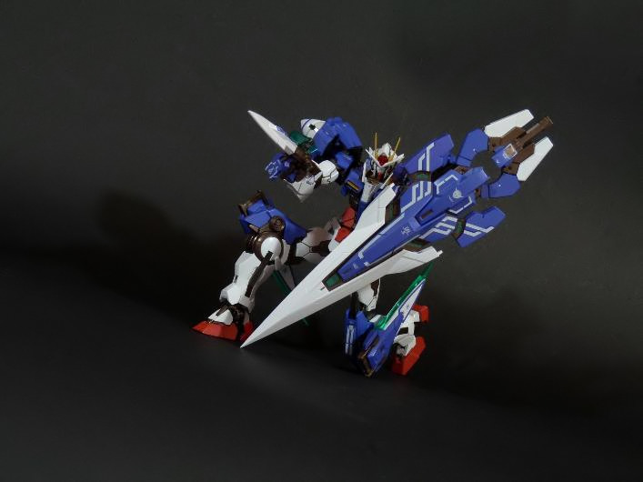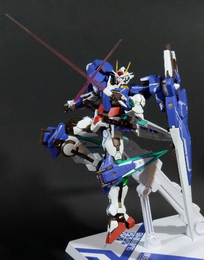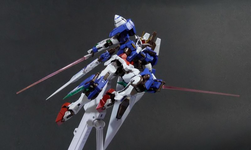 La funzionalità a cui facevo cenno poc’anzi è presto spiegata: concepito in questo modo, lo 00 Gundam “Seven Sword” è dotato di posabilità e stabilità eccellenti: le combinazioni possibili sfruttando la grandissima quantità di snodi (tutti ad attrito) sono impressionanti, e le pose anche più estreme e bellicose sono supportate dall’ottimale distribuzione dei pesi. Da questo punto di vista è un modello davvero riuscito, come è giusto che sia, vista l’enorme esperienza di Bandai in materia gundamica, che spazia dai noti model kit ad una enorme pletora di modelli come i già citati GFF Metal Composite, i Metal Material e così via.