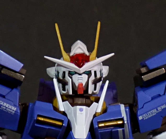 Andiamo nel dettaglio: per quanto riguarda la testa, essa può effettuare una rotazione completa di 360°, può essere inclinata più che discretamente verso l’alto, il basso e anche leggermente in senso laterale; tutto ciò è reso possibile dalla presenza di due micro-snodi che costituiscono la parte interna del collo. Vi consiglio di manipolare con cura questa parte, non perché sia particolarmente delicata, ma, viste le numerose “corna” e sporgenze appuntite che possono anche cozzare tra di loro, meglio evitarsi fastidiosi episodi. Discorso particolare meritano le spalle: permetterebbero alle braccia estensioni laterali e movimenti completi per avanti-alto-dietro, ma esse devono sobbarcarsi l’ingombrante presenza dei moduli GN-Drive posti proprio sopra di esse. Queste due vistose protuberanze coniche rappresentano dei potentissimi generatori perpetui d’energia, ed ostacolano la corsa delle braccia verso l’alto. Tuttavia, essi sono posti su un’impalcatura parzialmente metallica che ne permette lo spostamento all’indietro tramite una rotazione, così da liberare i movimenti degli arti superiori, senza sacrificare granchè l’estetica. Anzi, forse arricchendo ulteriormente il sapore hi-tech che pervade il mecha design e che personalmente adoro. Questa zona nasconde anche un altro paio di chicche, ma ve le lascio scoprire da soli: se siete appassionati della serie, o di Gundam in generale, apprezzerete certi dettagli.