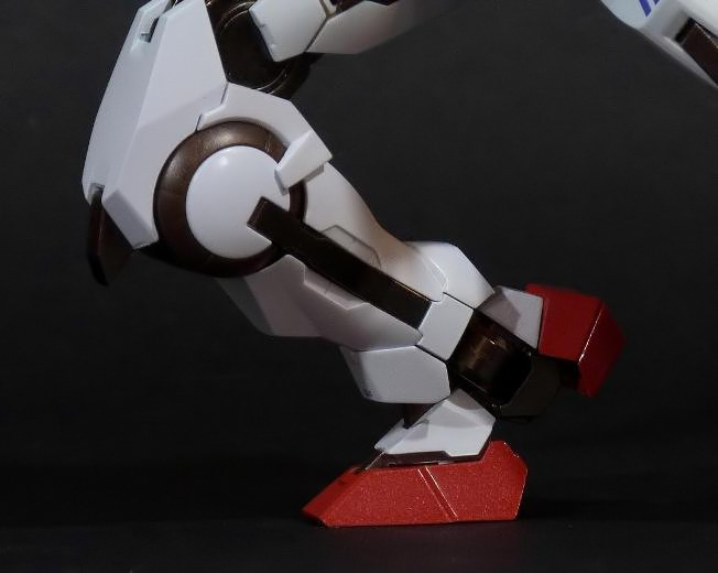 Molto interessante la concezione di gomiti e ginocchia, che presentano due snodi consecutivi ciascuno per poterli piegare in misura apprezzabilissima (le seconde anche fino a 180°), e buona anche la resa estetica della parte metallica satinata che riaffiora effettuando tali pieghe, che si integra perfettamente con le tinte bianche, blu e rosse delle parti in plastica. Braccia e cosce godono anche di rotazione laterale per metterle di profilo, un po’ limitata nel caso degli arti inferiori, ma comunque discreta. Altro piccolo, ma non scontato dettaglio lo ravvisiamo al livello dei polsi: l’aggancio delle mani avviene prevedibilmente utilizzando un piccolo snodo a sfera, che garantisce già una buona mobilità, ma appena prima di esso è possibile inclinare di pochi gradi tutto l’apparato polso-mano, cosa che in sé non sarebbe di sicuro trascendentale, però fa parte di tutta una serie di accortezze che impreziosiscono non poco il modello e lo rendono qualcosa di più del “solito Gundam”.