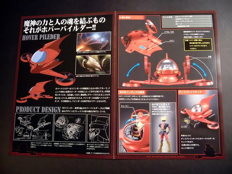 Con la nuova serie anime in uscita e la produzione del gx-45 Mazinger Z, Bandai torna a sorpresa a ridare nuova linfa vitale ad una serie di modelli che da anni in molti avevano dato per defunta, la Soul Of Popynica, specificamente ispirata ai vari mezzi locomotori tipici delle diverse serie anime e in cui il colosso giapponese ha inserito con un codice nuovo di zecca (px-04) un soggetto che in realtà di nuovo ha ben poco, e cioè l'Hover Pilder, riprodotto in questa occasione con i colori e le sembianze che lo caratterizzano nel nuovo anime. In realtà, come più avanti vedremo, si è trattato di un modo neanche troppo elegante per raggranellare qualche altro quattrino apportando minime ed insufficienti modifiche ad uno stampo che già era disponibile con il px-01. Ma andiamo a vedere nel dettaglio gli aspetti salienti di questo modello......