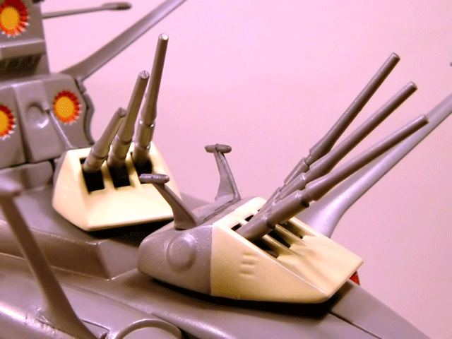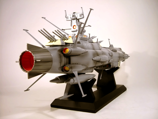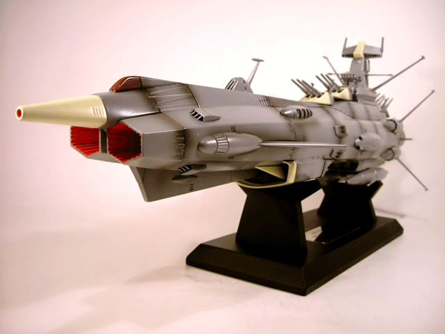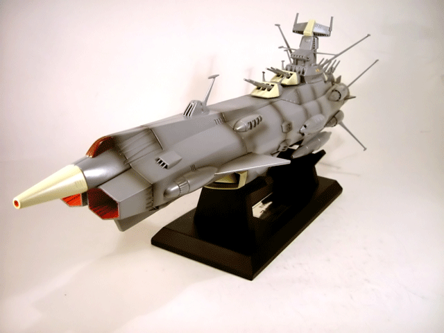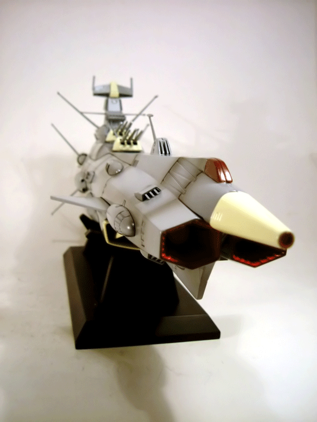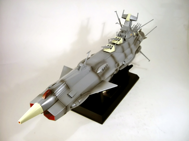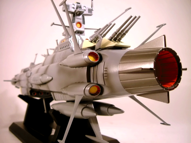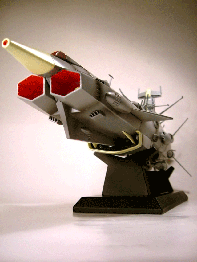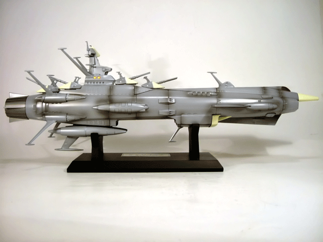 L'astronave è chiaramente molto pesante (è pur sempre un Daigokin) e indipendentemente da quanto riportato sulla scatola la mia personalissima bilancia indica 905 grammi. La lunghezza è invece confermata, 45 cm (in pratica scala 1:610 dato che l'astronave ha una lunghezza ufficiale di 275 metri), rappresentando tra le spaceships che possiedo quella dalle dimensioni certamente più cospicue. Ciò che meraviglia è invece il peso del display stand, questo, completamente nero, è realizzato con uno strano materiale sintetico simile alla pietra e pesantissimo, da solo sposta la lancetta della bilancia sui 540 grammi. Ha una base rettangolare di 20 x 9 cm e su di essa è applicata una targhetta metallica su cui è indicato in giapponese il nome del soggetto. Le antenne da applicare si attaccano con facilità e sono in plastica rigida, credo che sarebbe stato più intelligente se fossero state realizzate in plastica più morbida o in pvc, così da minimizzare i rischi di rotture accidentali. In plastica sono anche le batterie di cannoni, queste sono mobili, le torrette ruotano di 120 gradi circa e i cannoni sono indipendenti l'uno dall'altro potendo essere spostati singolarmente in alto e in basso. Occhio comunque a maneggiarli, soffrono di una certa delicatezza a livello delle antennine che li sormontano, quelle di una delle due torrette anteriori infatti si sono staccate mentre la spostavo. Poco male, basta una goccia di colla per plastica e tutto torna come nuovo ma ricordiamoci che stiamo pur sempre parlando di un oggetto che costa ben più di 300 euro e che quindi certe cose non si dovrebbero verificare. La verniciatura è ottima e distribuita in strato sufficientemente spesso ed uniforme, molto buona in ogni dettaglio, anche a livello delle invecchiature distribuite lungo le pannellature principali e non presenta particolari irregolarità, lo stesso dicasi per la verniciatura gialla in corrispondenza dei reattori. Accanto alla space battleship Yamato bpx-01 Bandai va a comporre un duo spettacolare, le invecchiature la rendono infatti meglio accostabile a quest'ultima, essendo anch'essa ricca di pannellature che le conferiscono un aspetto usurato dal tempo. Il corpo centrale è totalmente in metallo e comunque non è pieno ma presenta parti cave, in particolar modo nella porzione centrale del ponte. La torretta principale e tutte le appendici più esterne sono in materiale plastico. Complessivamente stiamo quindi parlando di un buon prodotto anche se c'è una cosa che non ho davvero digerito e che in un articolo "di elite" come vuole essere questo Daigokin non è francamente accettabile, sto parlando di quella evidente e bruttissima linea di giunzione tra le due metà dell'astronave che ne percorre il ponte longitudinalmente dal muso fino alla coda, cosa che in un'astronave Aoshima, tanto per fare un esempio, non si è mai vista essendo questi tipi di dettagli curati in modo più intelligente e meno vistoso. A questo punto un paragone con altri prodotti dello stesso livello diventa doveroso. Premesso che considero Aoshima la numero uno nella produzione delle astronavi (di gran lunga superiore anche a Bandai) c'è da chiedersi se valga la pena spendere per questa Andromeda solamente perchè appartenente alla serie Daigokin una cifra con cui potremmo tranquillamente acquistare 2-3 signore astronavi Aoshima. Badate, non sto dicendo che questa Andromeda mi ha deluso, sto affermando solamente che il prezzo è assolutamente eccessivo per ciò che questo modello è effettivamente. Se poi vogliamo infierire dicendo che le astronavi Aoshima sono spesso dotate anche di led luminosi (cosa di cui non vi è la men che minima traccia su questa spaceship) e di altre piccole chicche tipo miniature oltre ad avere probabilmente una percentuale di metallo più alta (il Super Atragon lungo 5 cm meno pesa appena 5 grammi in meno!), facciamolo pure.