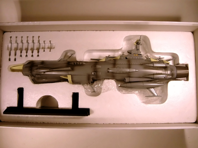 E' la tipica scatola in cartoncino rigido lucido dei Daigokin, ed è come da tradizione assai difficile da aprire per l'ottima tenuta del coperchio e l'effetto quasi sottovuoto che ne consegue.E' grande, molto grande, ed è pesante, molto pesante. Entrambe questi fattori la rendono un facile bersaglio delle attenzioni dei doganieri, aspetto da tenere attentamente in considerazione nel caso di acquisto dall'estero. Misura 51 x 24 x 17 cm per un peso di 2530 grammi. Bello l'artwork del coperchio, con il grosso nome, l'astronave ritratta in navigazione nello spazio e l'immagine della terra sullo sfondo. In laterale sono riportati i dati tecnici del modello e vengono decantati i suoi 45 cm di lunghezza per 1000 grammi di peso (in realtà quest'ultimo è di poco inferiore).