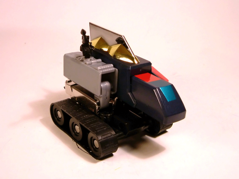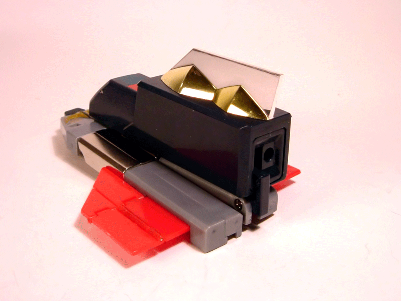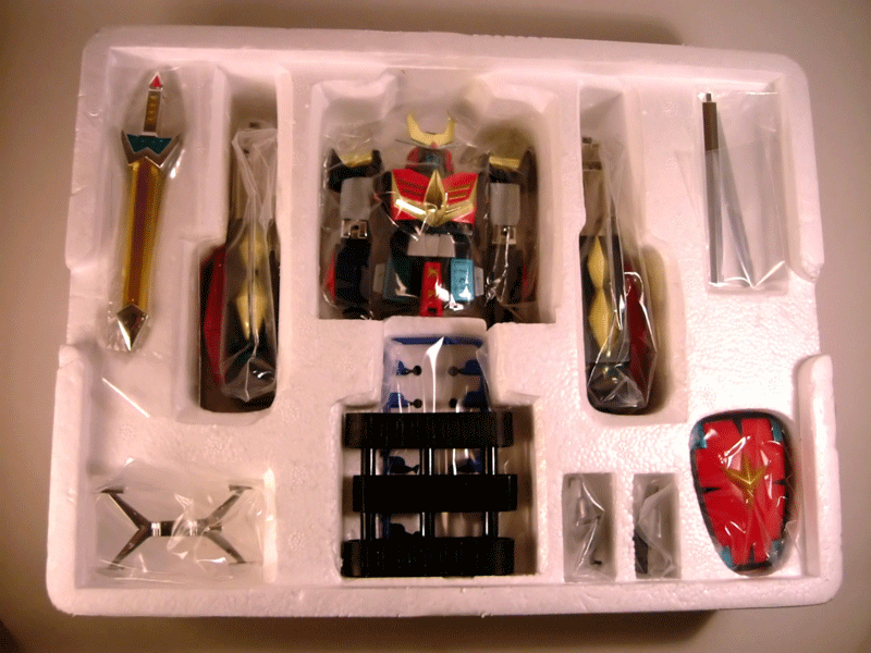 - Il contenitore in polistirolo all'interno del quale abbiamo alloggiati: le tre parti del robot in conformazione già pronta all'agganciamento, lo scudo, due pulse saber (spade a impulsi), un paio di cannoni laser, un paio di lame per simulare l'estrazione delle spade dai foderi, i cingoli applicabili al Cater Ranger, la miniatura di una navetta di Aldebaran (così venivano chiamati nella serie i caccia nemici), un'altra arma non meglio precisata ed i classici tappini coprivite di cui CM'S correda sempre i suoi Brave Gohkin.
