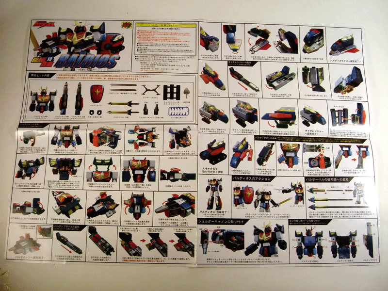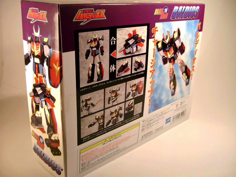La scatola ha dimensioni decisamente contenute (30 x 23 x 9 cm). Davanti vediamo ritratto il nostro Baldios con la sua bella spada e il suo splendente scudo in mano e i mezzi che lo compongono. Dietro è presente una suggestiva illustrazione del Baldios in fase di agganciamento e tutta una serie di piccole immagini che mostrano il robot, i mezzi ed i vari accessori inseriti nella confezione.