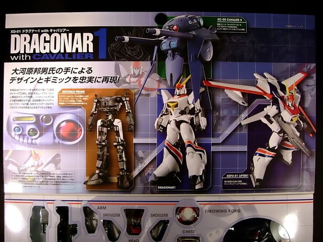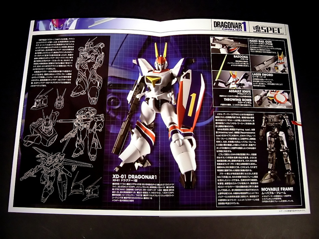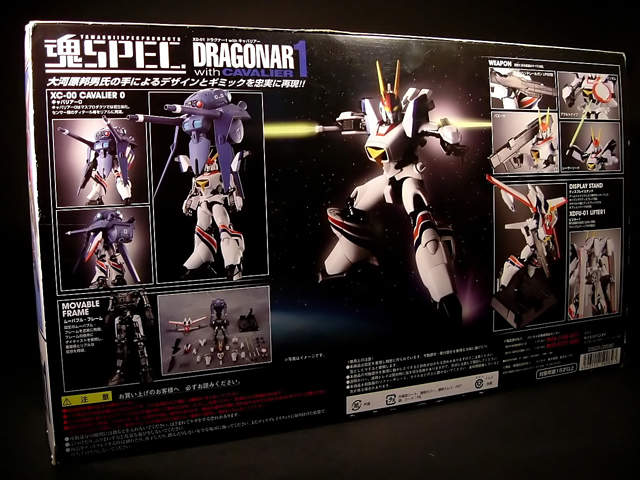 Molto carina e meno piccola di quanto credessi (37 x 21 x 9 cm). Caratteristica e già adottata per i precedenti SPEC la cover a strappo con velcro che, una volta aperta, scopre il contenuto, visibile attraverso finestrelle di plastica trasparente focalizzate sui singoli elementi presenti nella scatola. Sulla cover è ritratta, a destra, l'immagine del modello cui fanno da sfondo, spostandosi verso sinistra, altre due istantanee del robot, agganciato al cavalier e con le ali in posa di volo rispettivamente. In alto a sinistra sono stampati il logo della serie SPEC con il codice identificativo del modello stesso il cui nome è indicato, con caratteri più grandi, dallo stesso lato ma in basso. Nell'angolo in basso a destra, sopra al logo Bandai, fa invece mostra di se l'adesivo del trentennale Sunrise (che si celebrava per l'appunto, proprio nel 2007). La cover è peraltro illustrata anche sulla sua superficie posteriore, dove sostanzialmente viene evidenziata la struttura con inner frame metallico del modello e la presenza, tra i vari accessori, dei due principali mezzi di potenziamento, e cioè l'XC-00 Cavalier 0 e l'XDFU-01 Lifter 1 (in altre parole, le ali). Sul retro è invece raffigurato, in piccoli riquadri che contornano la grande immagine centrale del Dragonar che impugna la beam lancer, il ricco armamentario in dotazione.