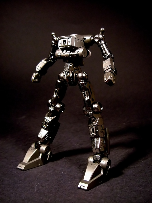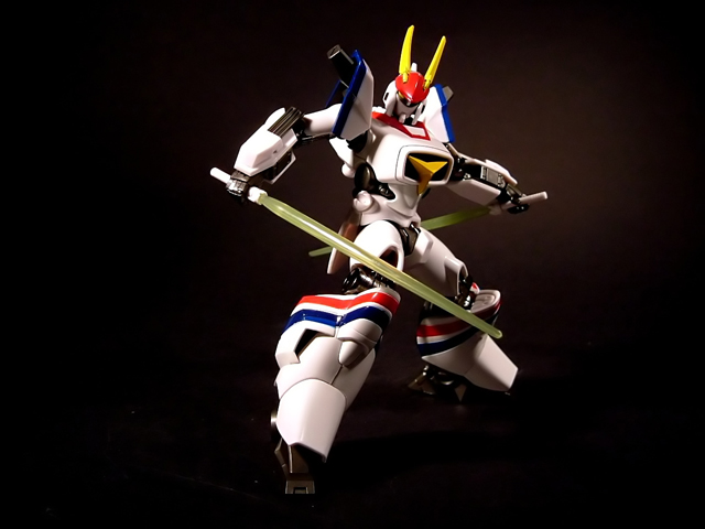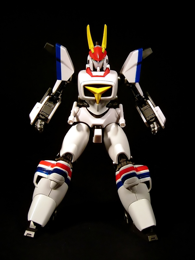 In linea con i precedenti Layzner e Dragonar sfornati per la medesima serie, questo XS-06 si caratterizza per altezza e composizione analoghi presentando dimensioni piuttosto contenute (14 cm, 16 cm circa alla punta delle antenne) e una concezione strutturale in cui le parti dell'armatura, in plastica, debbono essere montate su di uno scheletro prevalentemente anche se non esclusivamente in metallo esattamente uguale a quello dell'XS-05. E' proprio l'inner frame (in metallo a livello di gambe, cosce, bacino e braccia ma con piedi, torace e avambraccia in plastica) a fornire il grosso del peso al nostro modello spostando da solo l'ago della bilancia sui 112 grammi quando, ad armatura montata (senza ali ne' cavalier) si arriva a 148 grammi. In parole povere lo scheletro costituisce il 75% circa del peso globale. Il montaggio è relativamente semplice e rapido oltre ad essere ben indicato sul libretto di istruzioni. Se nel Dragonar opening silhouette (almeno nel mio esemplare) alcune parti soffrivano di una certa instabilità distaccandosi con sin troppa facilità (vedi uno dei due copripiedi) in questo caso non ho dovuto registrare problemi in tal senso, anche perchè i copripiedi a differenza dell'XS-05 non sono un elemento separato ma fanno parte integralmente del blocco della gamba per cui tutte le porzioni dell'armatura, una volta montate, rimangono ben solide nella loro posizione anche quando si cambia posa al modello. La verniciatura delle singole parti è ben curata salvo qualche sporadica e modesta imperfezione (leggi piccole sbavature nelle linee blu e rosse delle gambe). La posabilità, molto soddisfacente, è garantita esclusivamente da articolazioni ad attrito rigide quanto basta. Le caviglie hanno movimenti di lateralità molto validi e le ginocchia si flettono a più di 90 gradi. Le anche sono mobilissime in ogni direzione, anteriore, posteriore e laterale e le cosce ruotano sul loro asse longitudinale. Il tronco è snodato a livello del passaggio bacino-addome con notevoli escursioni in flessione e nelle torsioni laterali. La spalla ruota a 360 gradi e si abduce a 90 gradi. I gomiti si flettono oltre i 90 gradi ed i polsi, governati da piccoli perni con articolazione a sfera, lasciano una sufficiente libertà di movimento alle mani la cui applicazione è peraltro relativamente agevole. Anche l'aggancio della testa al torace è garantito da una articolazione a sfera che permette rotazioni a 360 gradi e buoni movimenti di flessione anteriore e laterale, con minima estesione. I manici delle beam saber sono applicabili ai relativi alloggiamenti ruotabili sulle anche del robot con aggancio ben solido, lo stesso dicasi per i caricatori dell'hand rail gun a livello degli avambracci mentre i foderi per gli assault knives sono sulla supeficie posteriore della gamba. L'applicazione del lifter e del cavalier fila liscia senza particolari intoppi. In questo caso, a differenza della opening silhouette, ho apprezzato la possibilità di attaccare le ali senza che il fregio sul petto del robot venga coperto come avveniva, per l'appunto, nell'XS-05. L'aggancio del lifter è molto valido e la sua applicazione non comporta significativi sbilanciamenti del modello ne' rischi di sfregamenti tra parti con conseguenti scrostature di vernice. Le ali sono ripiegabili così come i propulsori e la verniciatura non ha difetti evidenti. Anche il Cavalier 0 è facilmente assemblabile ed agganciabile, ha i cannoni direzionabili grazie a snodi a sfera e, come prevedibile, è interamente in plastica. Se con le ali il modello fa certamente una gran bella figura, lo stesso non si può però dire per la versione potenziata con il Cavalier 0 in cui in parole povere sembra che al nostro povero Dragonar sia stata calata in capo una pentola a pressione. Se quindi non esporrò mai il mio XS-06 in questo assetto, fa comunque piacere, per completezza, sapere di avere comunque a corredo del gokin anche questo accessorio. Più che soddisfacente il numero di mani, 3 paia più una mano destra per l'impugnatura del fucile è una dotazione di tutto rispetto per la quale metterei la firma in qualsiasi modello. Quanto alle antenne il mio personalissimo consiglio è sempre lo stesso, usate quelle più morbide perchè se è vero che quelle più rigide hanno minor tendenza ad incurvarsi, è altrettanto vero che in caso di cadute o contatti accidentali le prime a farne le spese proprio queste ultime essendo maggiormente esposte al rischio rottura. Un cenno a parte deve essere fatto per la basetta espositiva che, per come è stata concepita, aiuta certamente a valorizzare il nostro modello con la possibilità di pose di volo molto dinamiche. Grazie ad alcuni piccoli pannelli riproduce la rampa di lancio del robot ed il braccio che consente di tenere in sospensione il gokin è snodato sia nel punto di attacco alla base (così da regolare l'altezza a cui lo si voglia esporre) che all'estremità opposta, dove si àncora peraltro solidamente e affidabilmente al robot (a questo livello il perno di aggancio presenta escursioni sia in senso antero-posteriore che laterale).