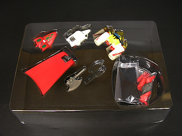 La scatola si presenta in acetato trasparente (dimensioni cm. 25 x 18 x 6 h.), con un flap superiore traforato per essere appeso ad un espositore. Il modello, diviso nelle tre Getter Machines, è perfettamente visibile, ed è carina l’esposizione atta a simulare la modalità di volo. Oltre alle Getter Machines si notano anche le Getter Wings e un Getter Tomahawk: eh, sì, uno solo… poiché avendo questo Getter un solo braccio sembrava superfluo aggiungere un’altra ascia. Purtroppo, così facendo, resta in bella vista uno spazio vuoto, tanto da far pensare che qualcuno ci abbia giocato un brutto scherzo…