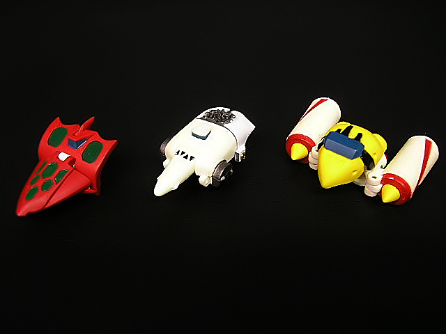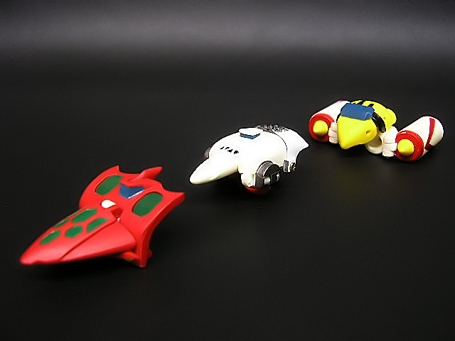 Tutti i pezzi si presentano prodotti nella consueta resina precolorata, con minimi segni di distacco da sprue, sempre comunque carteggiati. Le Getter Machines, pur lunghe 4/5 cm., sono abbastanza somiglianti e non deludono affatto in quanto a precisione di esecuzione. Purtroppo i danni che devono essere mostrati a robot finito, sono perfettamente visibili anche in modalità Machines. In particolare il Jaguar sembra appena stato abbattuto dalla contraerea… Inoltre, le parti specifiche di questa versione, come la mano aperta, il ventre ed il bacino danneggiato, sono stati prodotti in resina grigia e solo successivamente colorati: questo crea differenze cromatiche (ad es. tra braccio e mano) che sinceramente non mi sarei aspettato in una produzione sì “semplice”, ma solitamente curata come quelle dello Studio HalfEye