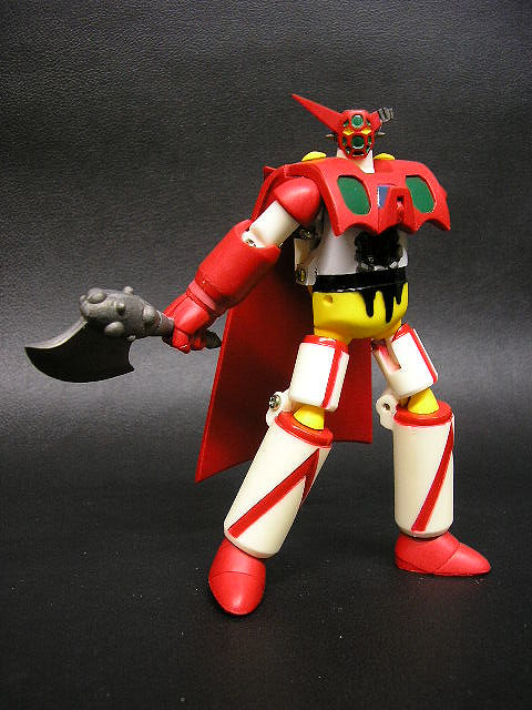 Nel 2003 Hajime Takashima pensò di allargare la base della sua clientela, includendovi coloro che desideravano un Getter trasformabile, ma non se la sentivano di investire un capitale nel Perfect Change Getter Robo.Nacque così la linea “Simple Change”, una serie di piccoli robot che dovevano replicare le trasformazioni viste negli anime, ma in maniera più… semplice, ricorrendo a parti aggiuntive, come pugni e piedi. Oltre alle dimensioni e ai gimmicks, anche i prezzi avrebbero dovuto essere più contenuti, benché modelli successivi come i Gravion difficilmente avrebbero potuto rientrare nella definizione di “economici”! Il primo robot della serie “Simple Change” fu l’SC-001 Getter One, nella versione tratta dai fumetti di Ken Ishikawa e dal restyle dell’OAV “The Last Day” e “Shin Getter vs. Neo Getter”. Si tratta di un piccolo e ingegnoso “toy” in grado di replicare la trasformazione delle tre Getter Machines nel solo Getter One. Dal medesimo stampo furono ricavate due edizioni limitate: “Mechanic” (300 pezzi) e “The Final Battle” (500 pezzi). Oggetto di questa recensione sarà proprio quest’ultimo, a ricordare la scena più epica del robot, il sacrificio del pilota Mushashi Tomoe che, strappando dal petto il generatore di raggi getter e sovraccaricandolo, si fa esplodere insieme ai Mechasaurus del Popolo Hachu!