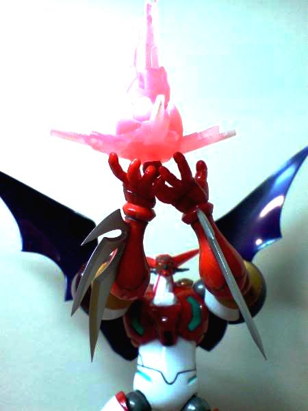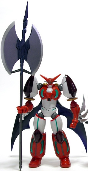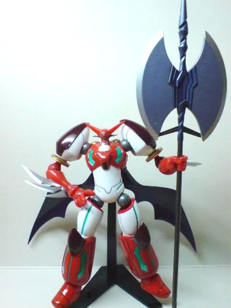 bagaglio di accessori, dal momento che la confezione comprende ascia gigante componibile in due parti, mani aperte, mani a pugno, mani per tenere l’asciagigante, una piattaforma nera con protesi per simulare le fasi di volo osospensione, ali, e, di un certo effetto, due pezzi di plastica rosata trasparente, che, assemblati, simulano il raggio getter, che può essere agganciato alle mani aperte.La scatola è di dimensioni non ingombranti (19x14x6cm): il modellino, l’ascia,e i pezzi per il raggio getter e le ali sono collocati in un vano di plastica scura. Il resto degli accessori è contenuto, invece, in una bustina sigillata trasparente, alloggiata sotto la parte cava dello scomparto in plastica.L’ascia è il pezzo che sembra più delicato, ma anche le ali e le lame sulle braccia del robot danno una certa idea di fragilità; forse, sarebbe stato più opportuno realizzare questi pezzi in gomma dura. La figure, tuttavia, è molto scenica (anche oltre i già pregevoli standard Revoltech), ancor più con l’ascia gigante, il raggio getter e le ali montate.Va rilevato che di questo Shin Getter 1 Revoltech (come per il Mazinkaiser e,di recente, il Getter Dragon) è stata proposta anche in una versione limitata,nera.Come per i più noti altri Revoltech della prima ondata (Gaiking, Mazinkaiser,Black Getter, Optimus Prime, in particolare), questo Shin getter 1 haconosciuto un certo aumento di prezzo nel corso degli anni, anche se in